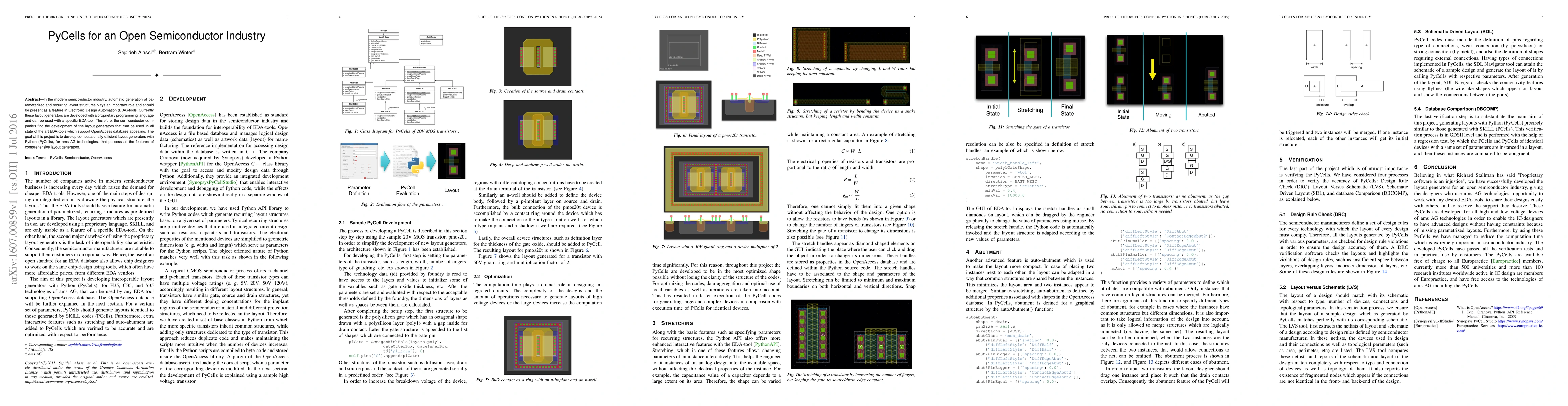 In the modern semiconductor industry, automatic generation of parameterized and recurring layout structures plays an important role and should be present as a feature in Electronic Design Automation (EDA)-tools. Currently these layout generators are developed with a proprietary programming language and can be used with a specific EDA-tool. Therefore, the semiconductor companies find the development of the layout generators that can be used in all state of the art EDA-tools which support OpenAccess database appealing. The goal of this project is to develop computationally efficient layout generators with Python (PyCells), for ams AG technologies, that possess all the features of comprehensive layout generators.