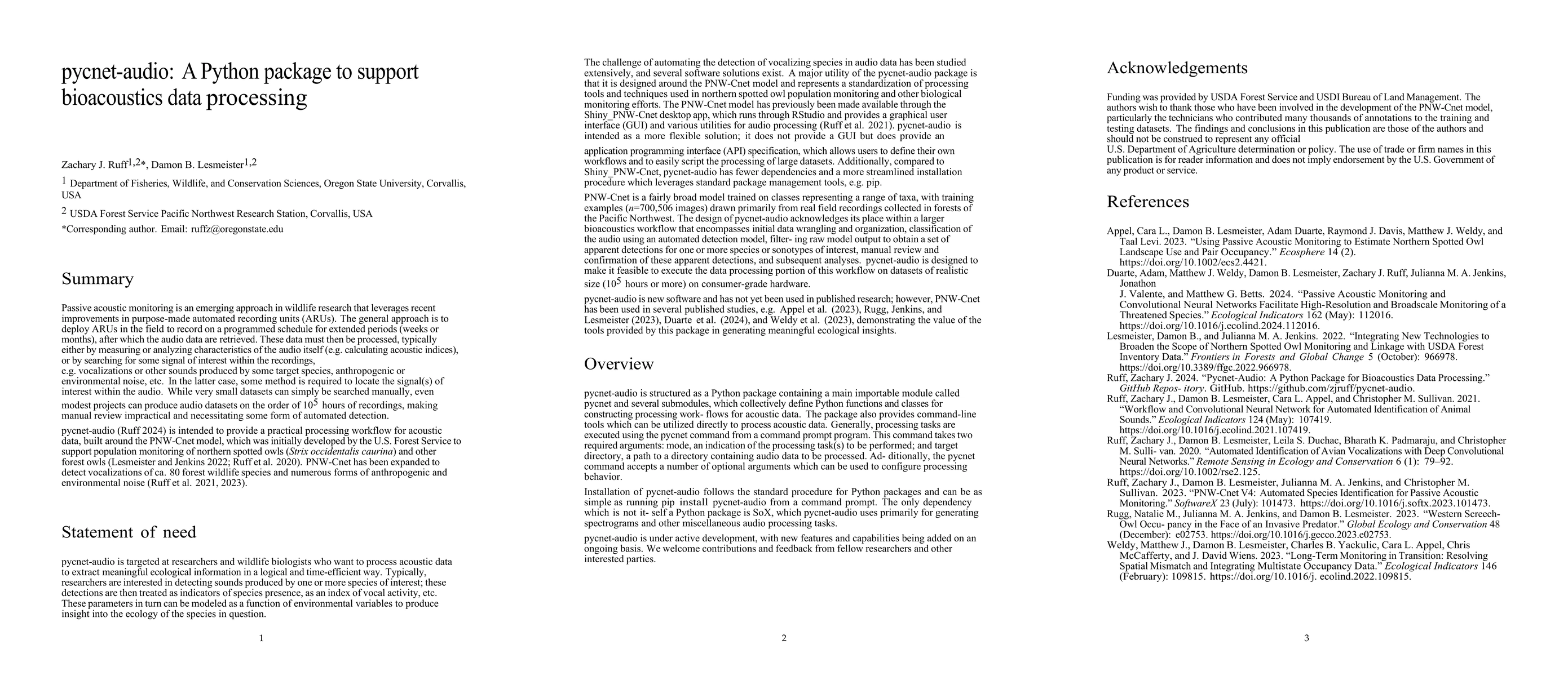 Passive acoustic monitoring is an emerging approach in wildlife research that leverages recent improvements in purpose-made automated recording units (ARUs). The general approach is to deploy ARUs in the field to record on a programmed schedule for extended periods (weeks or months), after which the audio data are retrieved. These data must then be processed, typically either by measuring or analyzing characteristics of the audio itself (e.g. calculating acoustic indices), or by searching for some signal of interest within the recordings, e.g. vocalizations or other sounds produced by some target species, anthropogenic or environmental noise, etc. In the latter case, some method is required to locate the signal(s) of interest within the audio. While very small datasets can simply be searched manually, even modest projects can produce audio datasets on the order of 105 hours of recordings, making manual review impractical and necessitating some form of automated detection. pycnet-audio (Ruff 2024) is intended to provide a practical processing workflow for acoustic data, built around the PNW-Cnet model, which was initially developed by the U.S. Forest Service to support population monitoring of northern spotted owls (Strix occidentalis caurina) and other forest owls (Lesmeister and Jenkins 2022; Ruff et al. 2020). PNW-Cnet has been expanded to detect vocalizations of ca. 80 forest wildlife species and numerous forms of anthropogenic and environmental noise (Ruff et al. 2021, 2023).