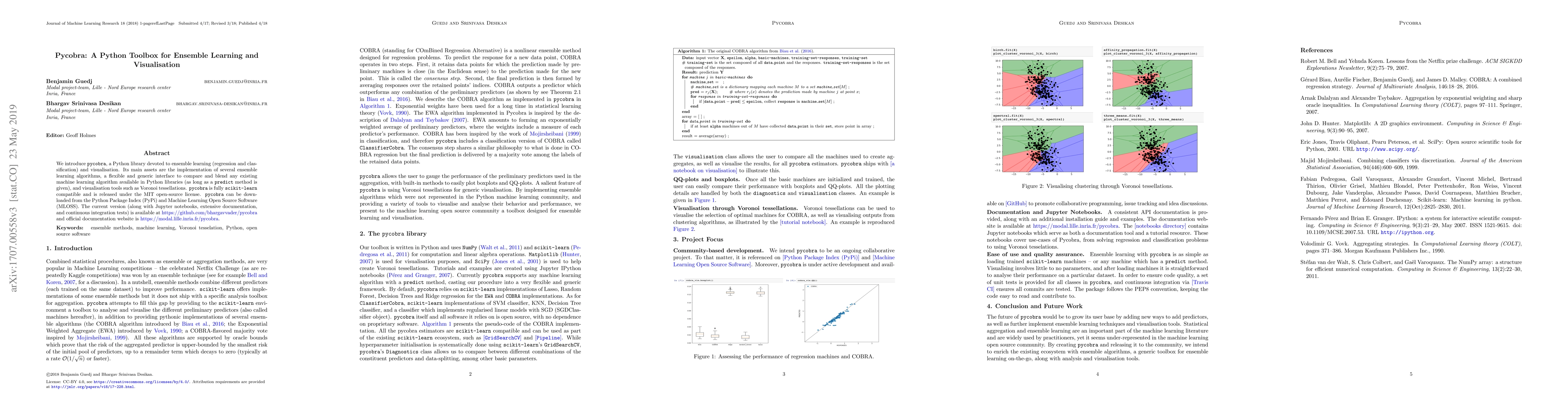 We introduce \texttt{pycobra}, a Python library devoted to ensemble learning (regression and classification) and visualisation. Its main assets are the implementation of several ensemble learning algorithms, a flexible and generic interface to compare and blend any existing machine learning algorithm available in Python libraries (as long as a \texttt{predict} method is given), and visualisation tools such as Voronoi tessellations. \texttt{pycobra} is fully \texttt{scikit-learn} compatible and is released under the MIT open-source license. \texttt{pycobra} can be downloaded from the Python Package Index (PyPi) and Machine Learning Open Source Software (MLOSS). The current version (along with Jupyter notebooks, extensive documentation, and continuous integration tests) is available at \href{https://github.com/bhargavvader/pycobra}{https://github.com/bhargavvader/pycobra} and official documentation website is \href{https://modal.lille.inria.fr/pycobra}{https://modal.lille.inria.fr/pycobra}.