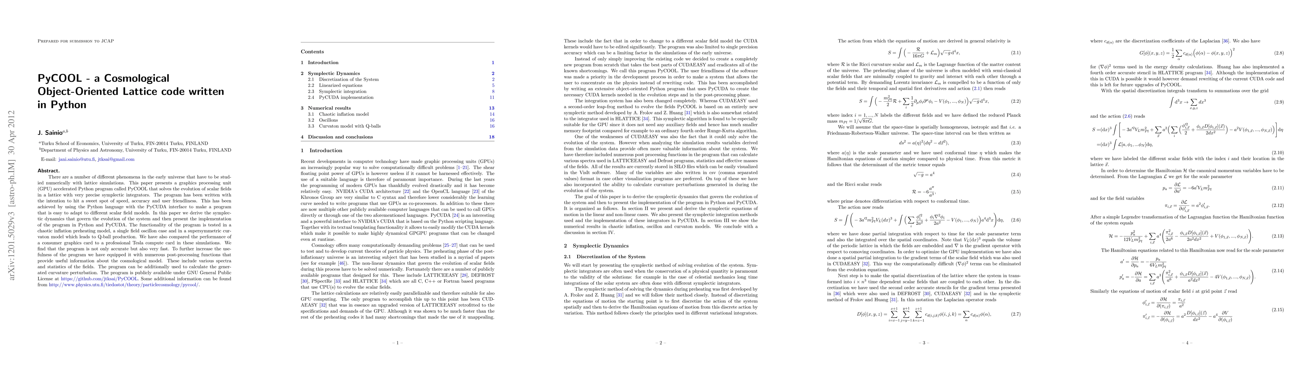There are a number of different phenomena in the early universe that have to be studied numerically with lattice simulations. This paper presents a graphics processing unit (GPU) accelerated Python program called PyCOOL that solves the evolution of scalar fields in a lattice with very precise symplectic integrators. The program has been written with the intention to hit a sweet spot of speed, accuracy and user friendliness. This has been achieved by using the Python language with the PyCUDA interface to make a program that is easy to adapt to different scalar field models. In this paper we derive the symplectic dynamics that govern the evolution of the system and then present the implementation of the program in Python and PyCUDA. The functionality of the program is tested in a chaotic inflation preheating model, a single field oscillon case and in a supersymmetric curvaton model which leads to Q-ball production. We have also compared the performance of a consumer graphics card to a professional Tesla compute card in these simulations. We find that the program is not only accurate but also very fast. To further increase the usefulness of the program we have equipped it with numerous post-processing functions that provide useful information about the cosmological model. These include various spectra and statistics of the fields. The program can be additionally used to calculate the generated curvature perturbation. The program is publicly available under GNU General Public License at https://github.com/jtksai/PyCOOL . Some additional information can be found from http://www.physics.utu.fi/tiedostot/theory/particlecosmology/pycool/ .