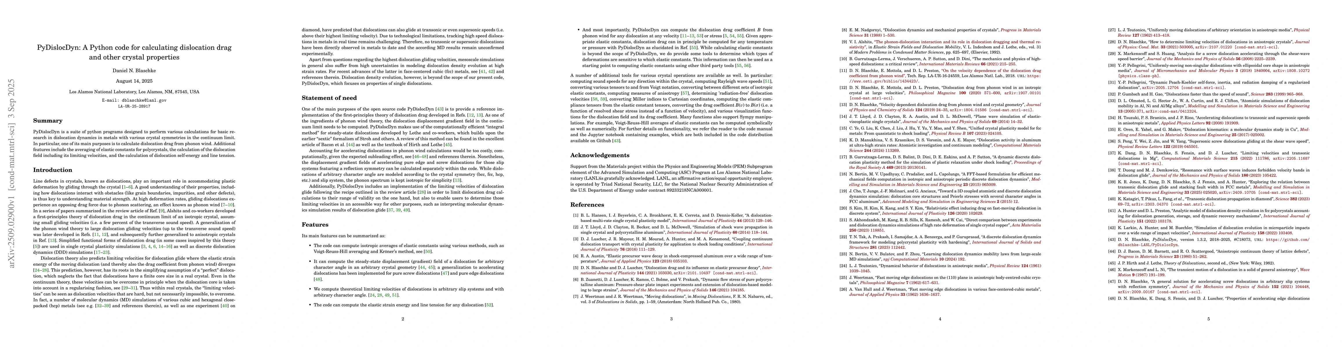 PyDislocDyn is a suite of python programs designed to perform various calculations for basic research in dislocation dynamics in metals with various crystal symmetries in the continuum limit. In particular, one of its main purposes is to calculate dislocation drag from phonon wind. Additional features include the averaging of elastic constants for polycrystals, the calculation of the dislocation field including its limiting velocities, and the calculation of dislocation self-energy and line tension.