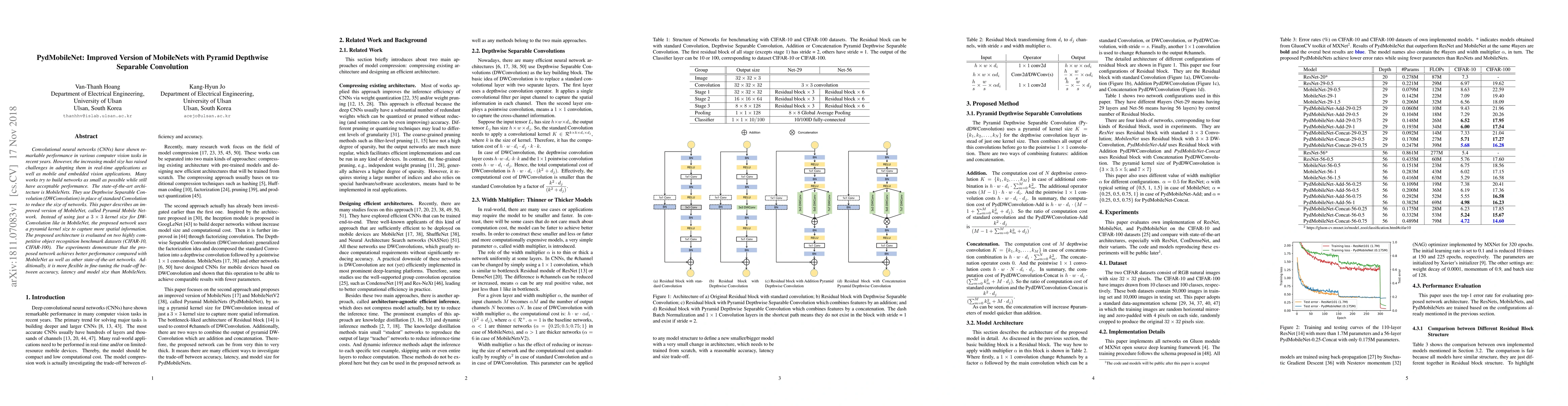 The paper introduces PydMobileNet, an enhanced version of MobileNets that employs pyramid kernel sizes in Depthwise Separable Convolution to capture more spatial information. The proposed network outperforms MobileNet and other state-of-the-art networks on CIFAR-10 and CIFAR-100 datasets, offering better flexibility in balancing accuracy, latency, and model size.