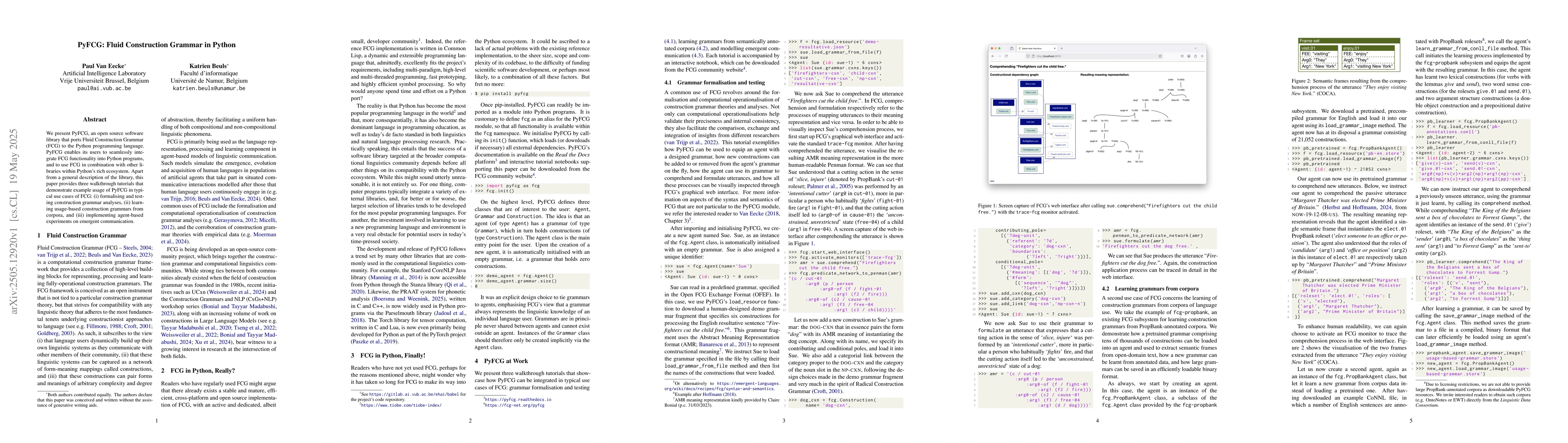 PyFCG is an open-source Python library that enables seamless integration of Fluid Construction Grammar functionality into Python programs, allowing users to formalize and test analyses, learn usage-based grammars from corpora, and implement agent-based experiments.