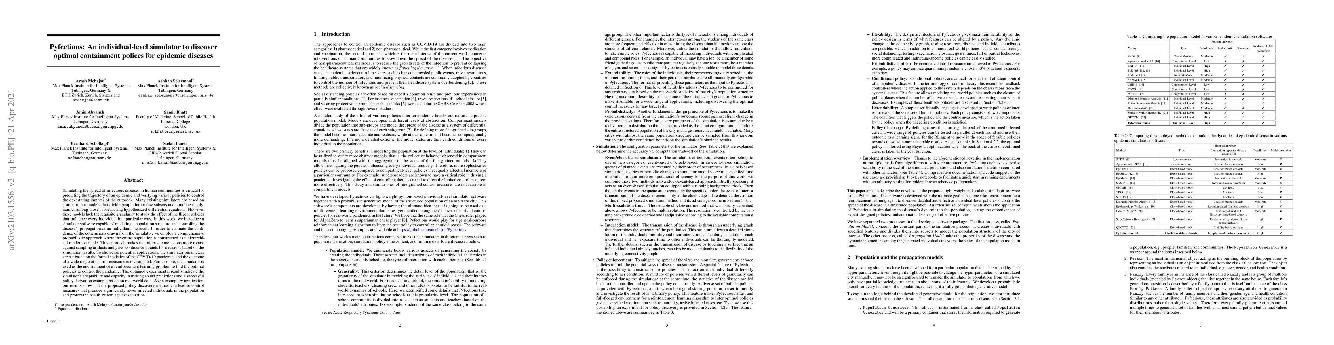Simulating the spread of infectious diseases in human communities is critical for predicting the trajectory of an epidemic and verifying various policies to control the devastating impacts of the outbreak. Many existing simulators are based on compartment models that divide people into a few subsets and simulate the dynamics among those subsets using hypothesized differential equations. However, these models lack the requisite granularity to study the effect of intelligent policies that influence every individual in a particular way. In this work, we introduce a simulator software capable of modeling a population structure and controlling the disease's propagation at an individualistic level. In order to estimate the confidence of the conclusions drawn from the simulator, we employ a comprehensive probabilistic approach where the entire population is constructed as a hierarchical random variable. This approach makes the inferred conclusions more robust against sampling artifacts and gives confidence bounds for decisions based on the simulation results. To showcase potential applications, the simulator parameters are set based on the formal statistics of the COVID-19 pandemic, and the outcome of a wide range of control measures is investigated. Furthermore, the simulator is used as the environment of a reinforcement learning problem to find the optimal policies to control the pandemic. The obtained experimental results indicate the simulator's adaptability and capacity in making sound predictions and a successful policy derivation example based on real-world data. As an exemplary application, our results show that the proposed policy discovery method can lead to control measures that produce significantly fewer infected individuals in the population and protect the health system against saturation.