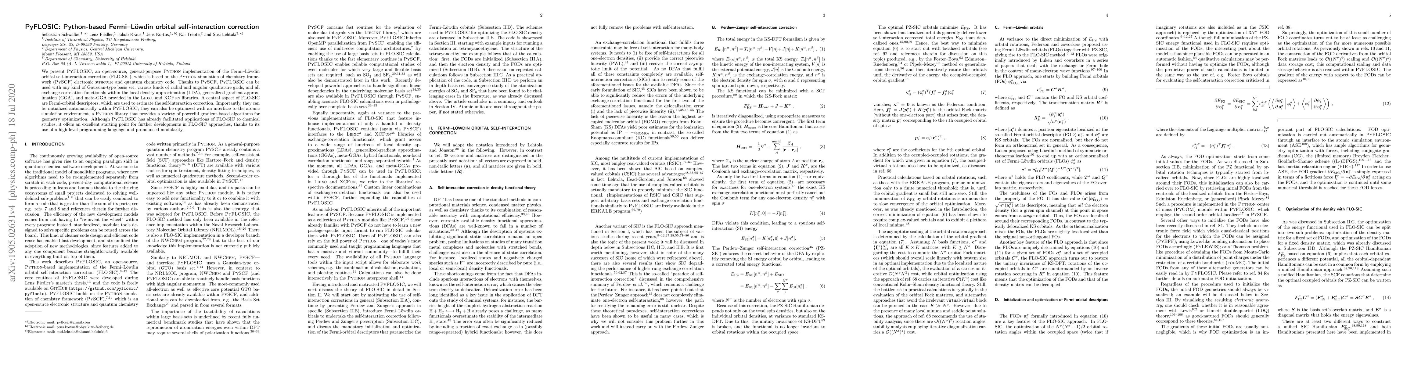 PyFLOSIC is an open-source Python implementation of the Fermi-Löwdin orbital self-interaction correction (FLO-SIC) based on the PySCF framework, supporting various basis sets and functionals. It facilitates the automatic initialization and optimization of Fermi-orbital descriptors for self-interaction correction.