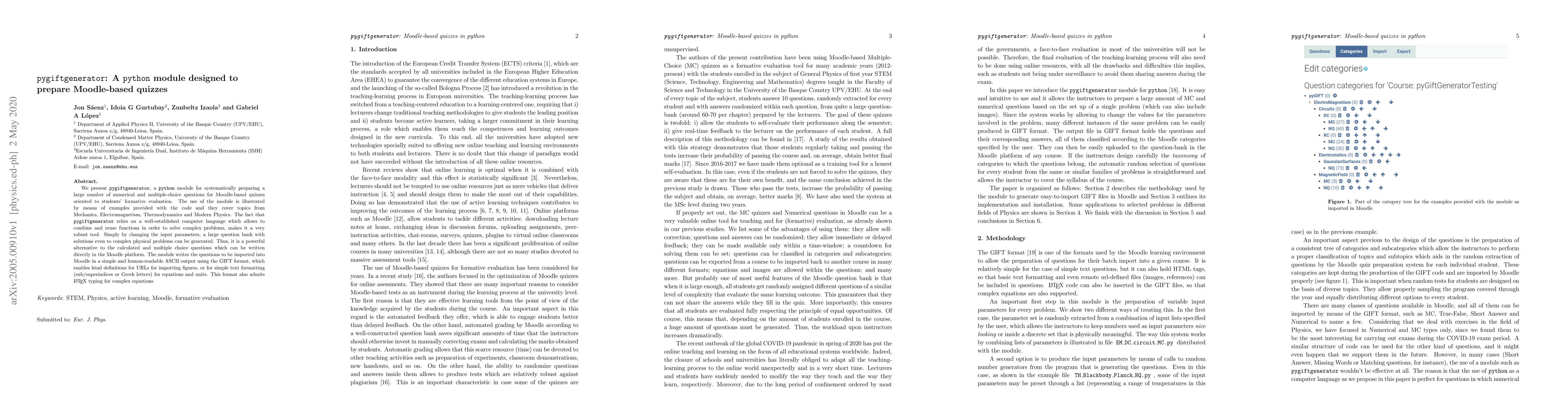 Summary: pygiftgenerator is a Python module designed to automate the creation of numerical and multiple-choice questions for Moodle quizzes, particularly in physics. It generates a large question bank with solutions, supporting complex problems and utilizing the GIFT format for easy import into Moodle.