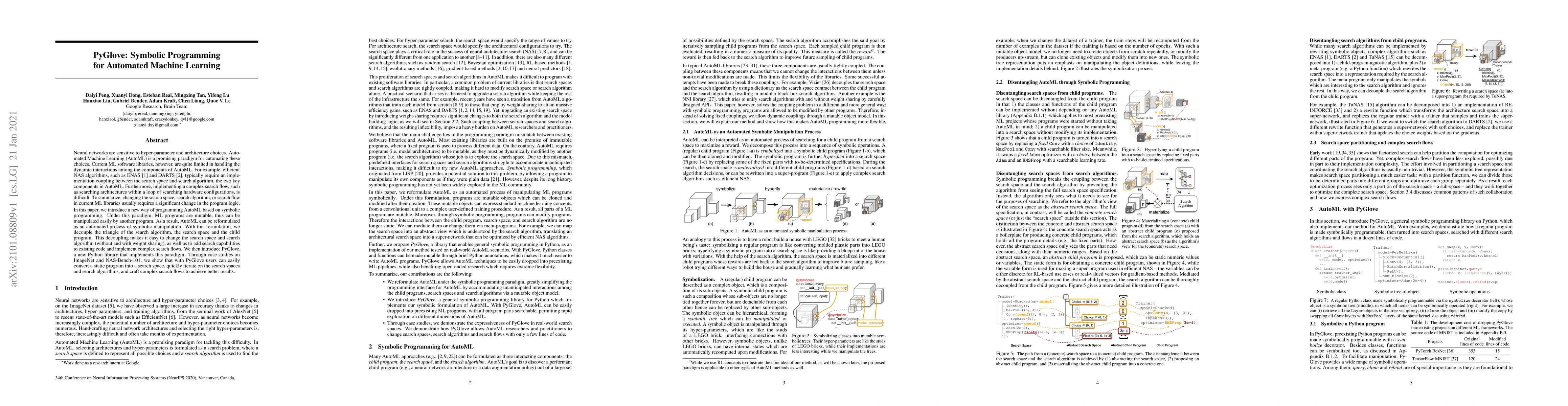 Neural networks are sensitive to hyper-parameter and architecture choices. Automated Machine Learning (AutoML) is a promising paradigm for automating these choices. Current ML software libraries, however, are quite limited in handling the dynamic interactions among the components of AutoML. For example, efficientNAS algorithms, such as ENAS and DARTS, typically require an implementation coupling between the search space and search algorithm, the two key components in AutoML. Furthermore, implementing a complex search flow, such as searching architectures within a loop of searching hardware configurations, is difficult. To summarize, changing the search space, search algorithm, or search flow in current ML libraries usually requires a significant change in the program logic. In this paper, we introduce a new way of programming AutoML based on symbolic programming. Under this paradigm, ML programs are mutable, thus can be manipulated easily by another program. As a result, AutoML can be reformulated as an automated process of symbolic manipulation. With this formulation, we decouple the triangle of the search algorithm, the search space and the child program. This decoupling makes it easy to change the search space and search algorithm (without and with weight sharing), as well as to add search capabilities to existing code and implement complex search flows. We then introduce PyGlove, a new Python library that implements this paradigm. Through case studies on ImageNet and NAS-Bench-101, we show that with PyGlove users can easily convert a static program into a search space, quickly iterate on the search spaces and search algorithms, and craft complex search flows to achieve better results.