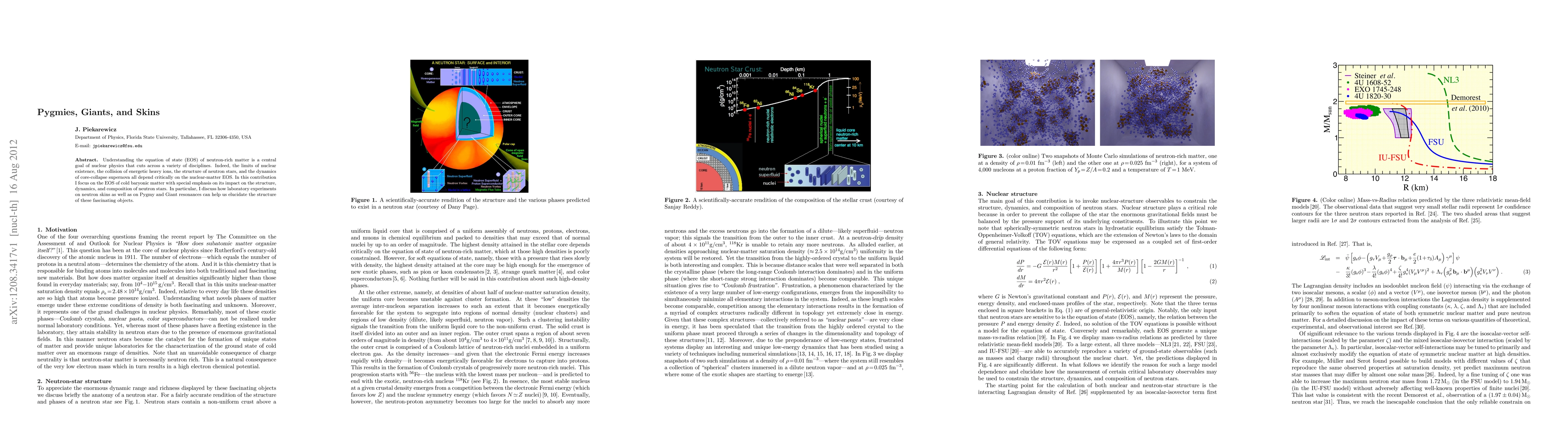 Understanding the equation of state (EOS) of neutron-rich matter is a central goal of nuclear physics that cuts across a variety of disciplines. Indeed, the limits of nuclear existence, the collision of energetic heavy ions, the structure of neutron stars, and the dynamics of core-collapse supernova all depend critically on the nuclear-matter EOS. In this contribution I focus on the EOS of cold baryonic matter with special emphasis on its impact on the structure, dynamics, and composition of neutron stars. In particular, I discuss how laboratory experiments on neutron skins as well as on Pygmy and Giant resonances can help us elucidate the structure of these fascinating objects.