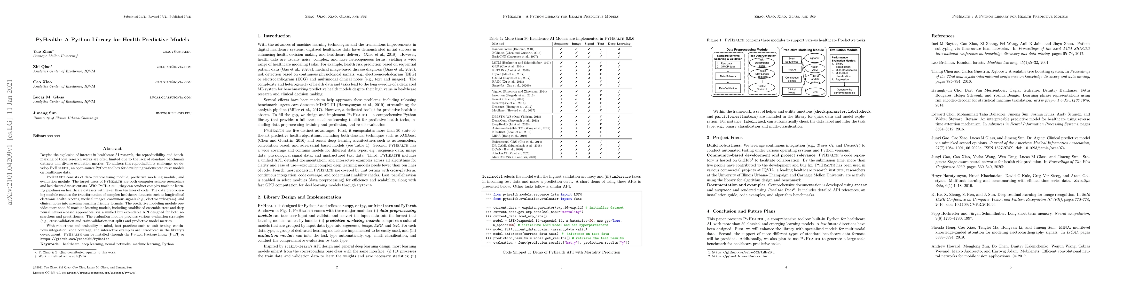PyHealth is an open-source Python library designed to facilitate the development of predictive models for healthcare data. It offers modules for data preprocessing, predictive modeling, and evaluation, aiming to improve reproducibility and benchmarking in healthcare AI research.