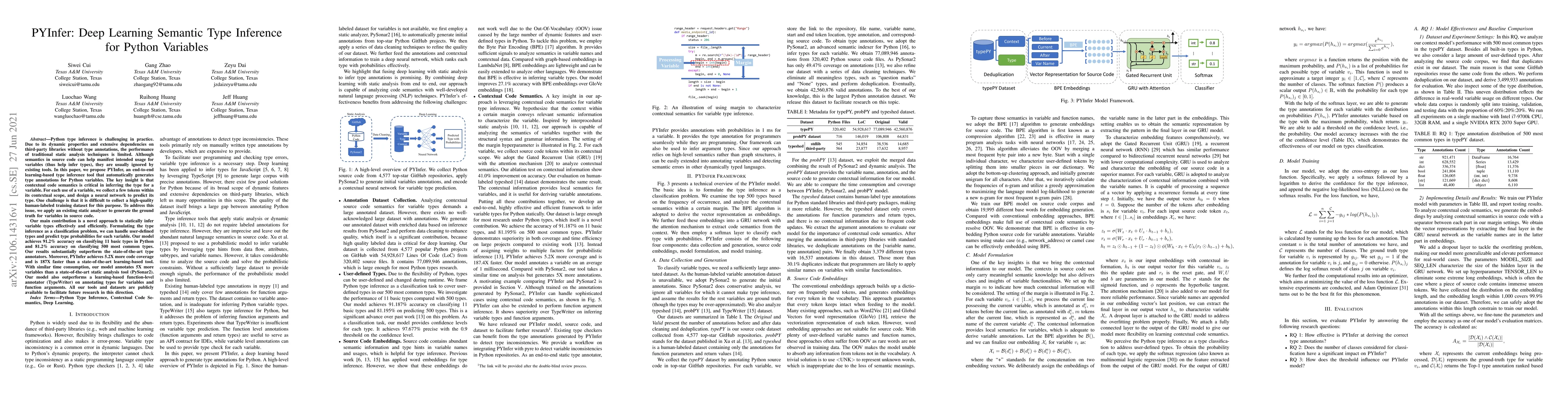 PYInfer is a deep learning-based tool for inferring types of Python variables, utilizing contextual code semantics. It employs BPE embeddings to handle OOV issues and a GRU network with attention mechanism for semantic extraction. The model is trained on a large annotated dataset, considering context within a specified margin.