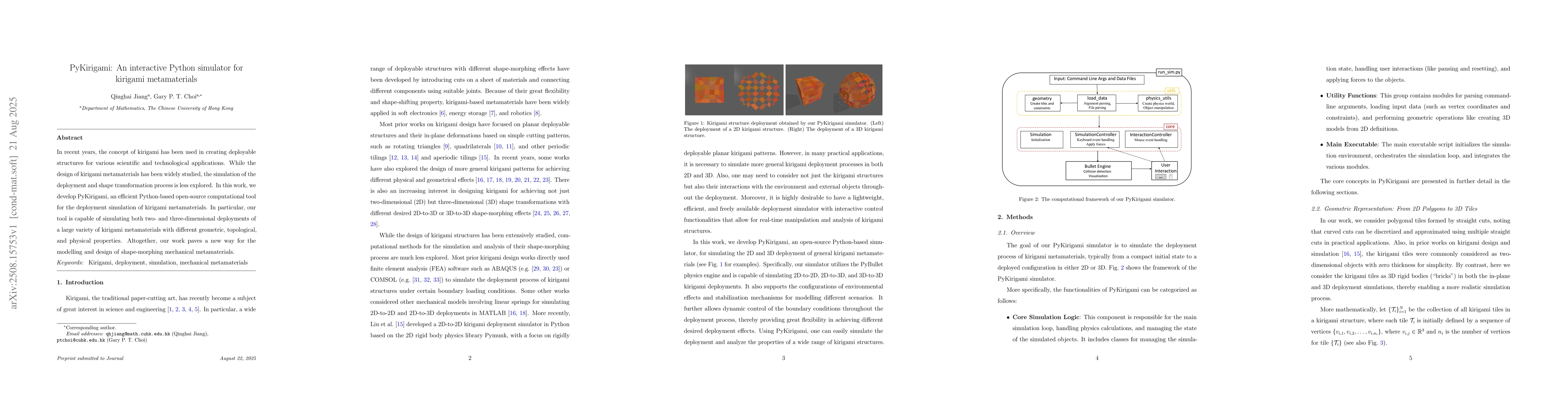 In recent years, the concept of kirigami has been used in creating deployable structures for various scientific and technological applications. While the design of kirigami metamaterials has been widely studied, the simulation of the deployment and shape transformation process is less explored. In this work, we develop PyKirigami, an efficient Python-based open-source computational tool for the deployment simulation of kirigami metamaterials. In particular, our tool is capable of simulating both two- and three-dimensional deployments of a large variety of kirigami metamaterials with different geometric, topological, and physical properties. Altogether, our work paves a new way for the modelling and design of shape-morphing mechanical metamaterials.