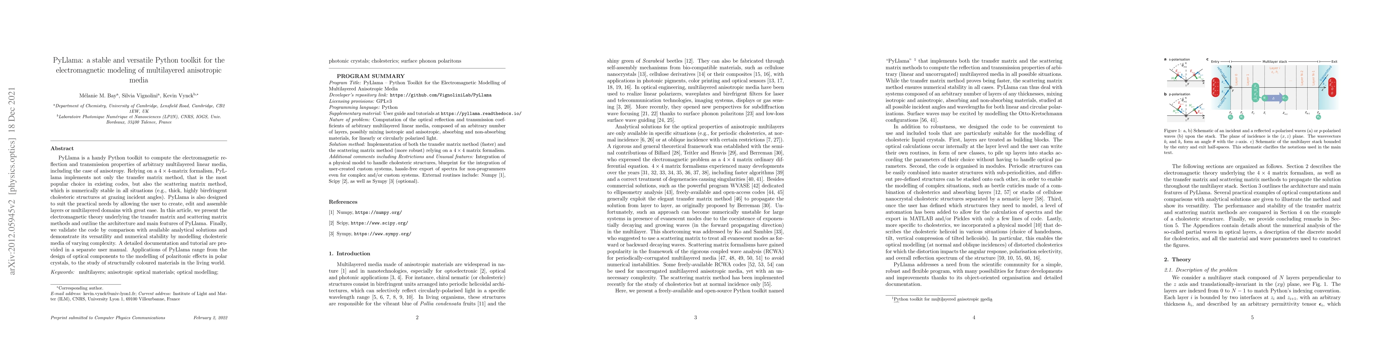 PyLlama is a Python toolkit for electromagnetic modeling of multilayered anisotropic media, employing both transfer and scattering matrix methods for stable and versatile simulations. It is validated against analytical solutions and applied to complex cholesteric structures, with detailed documentation available.