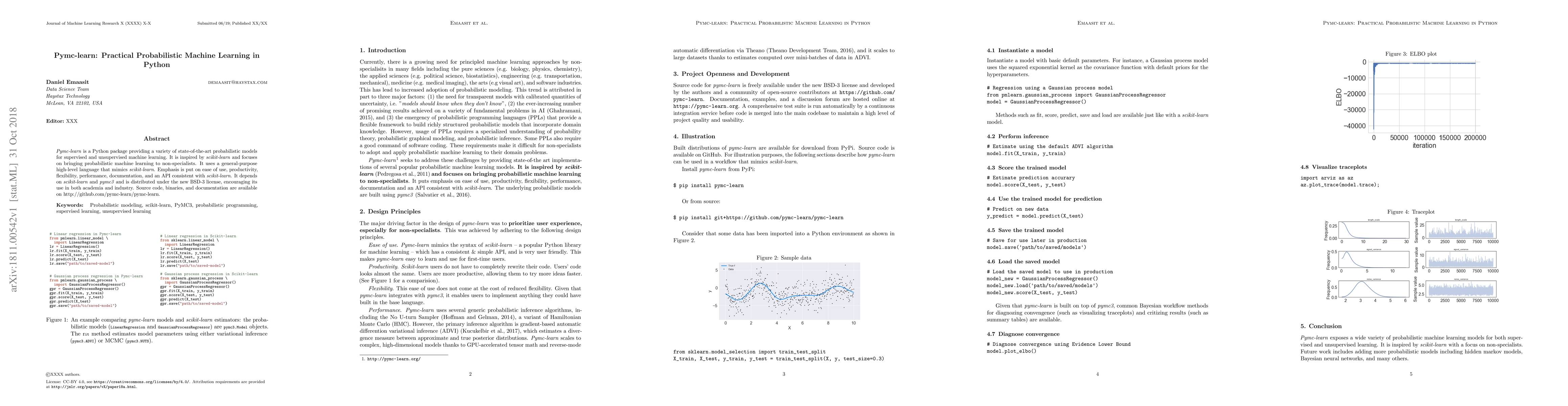 Pymc-learn is a Python package offering advanced probabilistic machine learning models, inspired by scikit-learn, aimed at non-specialists. It emphasizes ease of use, flexibility, and performance, and is distributed under a BSD-3 license.