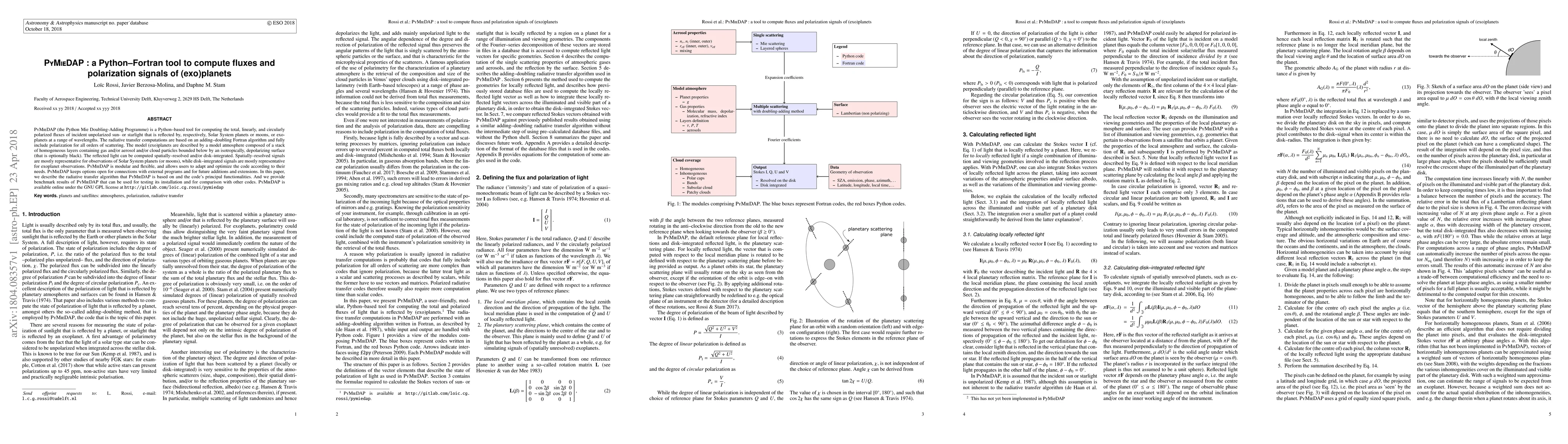 PyMieDAP (the Python Mie Doubling-Adding Programme) is a Python--based tool for computing the total, linearly, and circularly polarized fluxes of incident unpolarized sun- or starlight that is reflected by, respectively, Solar System planets or moons, or exoplanets at a range of wavelengths. The radiative transfer computations are based on an adding--doubling Fortran algorithm and fully include polarization for all orders of scattering. The model (exo)planets are described by a model atmosphere composed of a stack of homogeneous layers containing gas and/or aerosol and/or cloud particles bounded below by an isotropically, depolarizing surface (that is optionally black). The reflected light can be computed spatially--resolved and/or disk--integrated. Spatially--resolved signals are mostly representative for observations of Solar System planets (or moons), while disk--integrated signals are mostly representative for exoplanet observations. PyMieDAP is modular and flexible, and allows users to adapt and optimize the code according to their needs. PyMieDAP keeps options open for connections with external programs and for future additions and extensions. In this paper, we describe the radiative transfer algorithm that PyMieDAP is based on and the code's principal functionalities. And we provide benchmark results of PyMieDAP that can be used for testing its installation and for comparison with other codes. PyMieDAP is available online under the GNU GPL license at http://gitlab.com/loic.cg.rossi/pymiedap