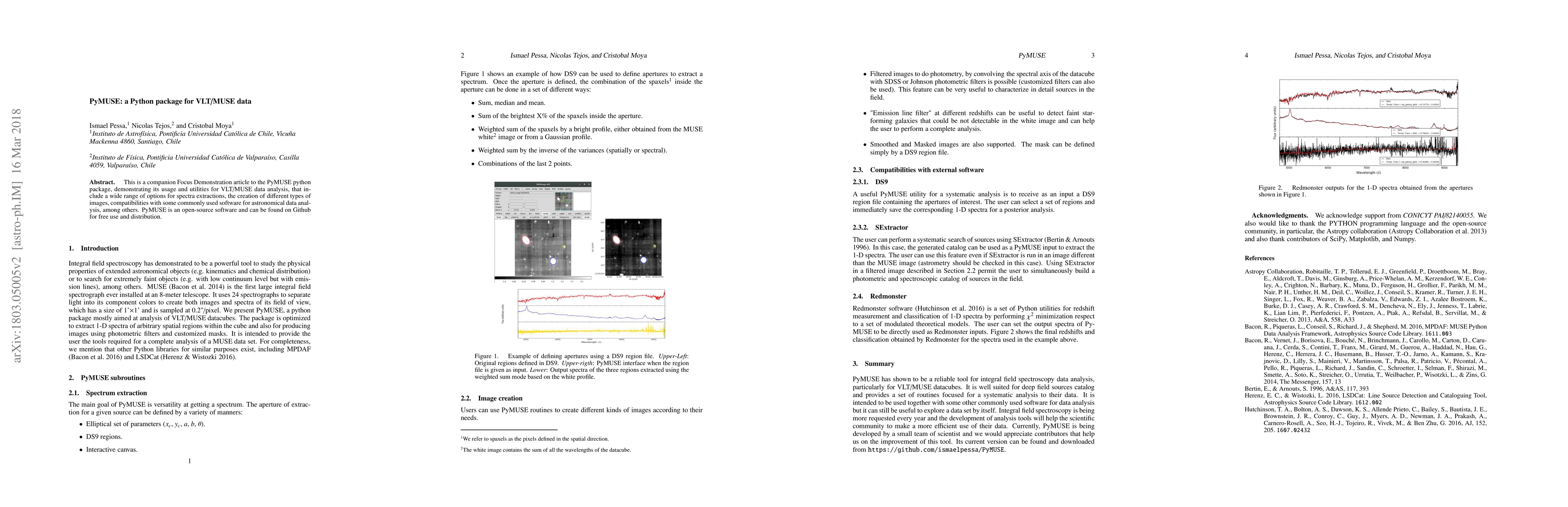 PyMUSE is an open-source Python package for analyzing VLT/MUSE data, offering a range of options for spectra extractions and image creation, compatible with various astronomical software tools.