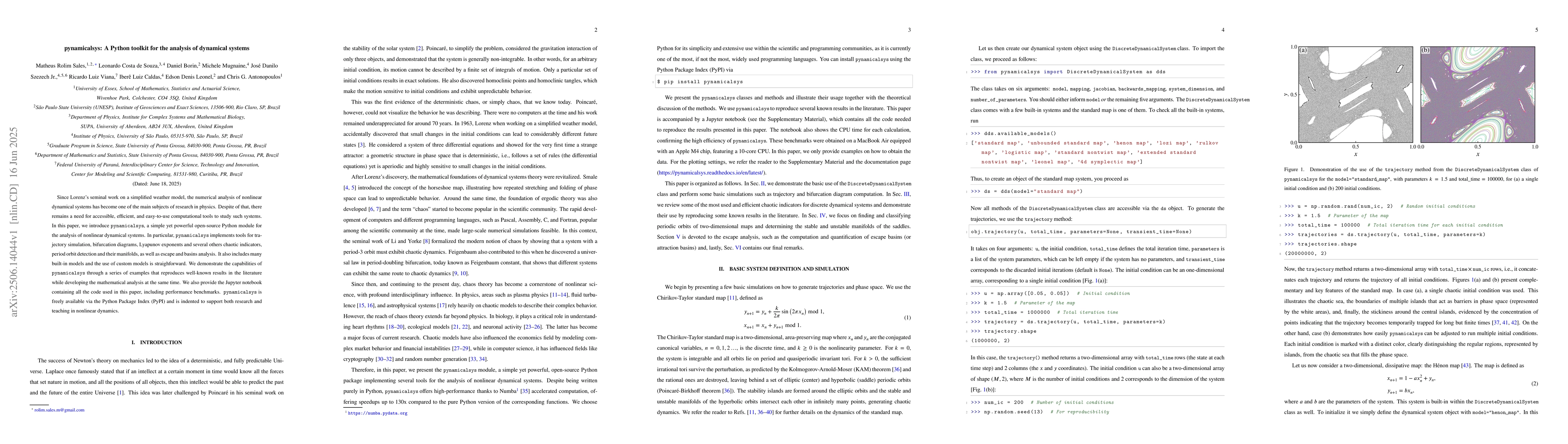 Since Lorenz's seminal work on a simplified weather model, the numerical analysis of nonlinear dynamical systems has become one of the main subjects of research in physics. Despite of that, there remains a need for accessible, efficient, and easy-to-use computational tools to study such systems. In this paper, we introduce pynamicalsys, a simple yet powerful open-source Python module for the analysis of nonlinear dynamical systems. In particular, pynamicalsys implements tools for trajectory simulation, bifurcation diagrams, Lyapunov exponents and several others chaotic indicators, period orbit detection and their manifolds, as well as escape and basins analysis. It also includes many built-in models and the use of custom models is straighforward. We demonstrate the capabilities of pynamicalsys through a series of examples that reproduces well-known results in the literature while developing the mathematical analysis at the same time. We also provide the Jupyter notebook containing all the code used in this paper, including performance benchmarks. pynamicalsys is freely available via the Python Package Index (PyPI) and is indented to support both research and teaching in nonlinear dynamics.