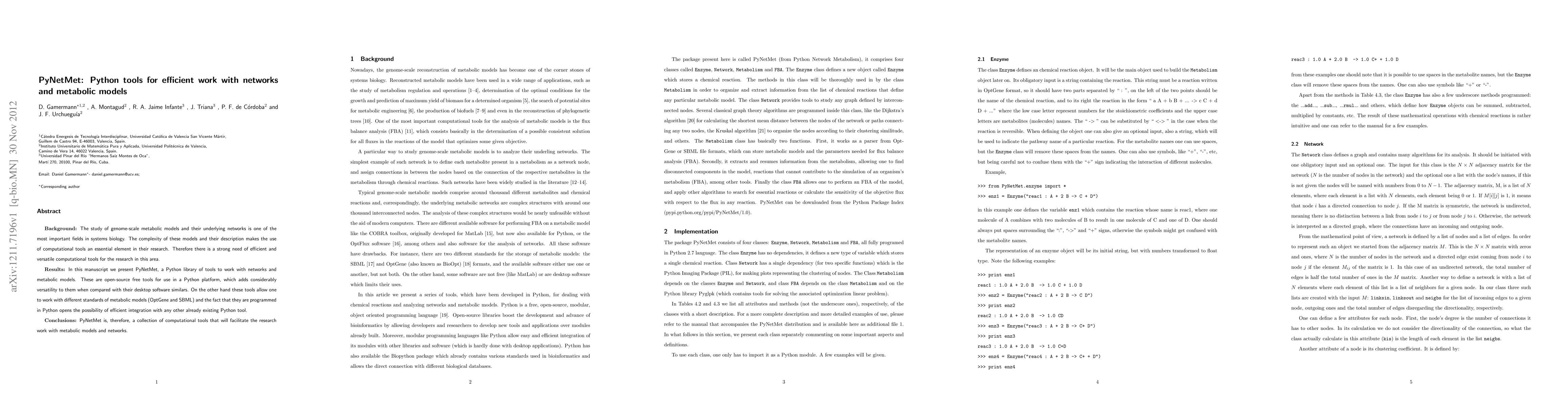 Background: The study of genome-scale metabolic models and their underlying networks is one of the most important fields in systems biology. The complexity of these models and their description makes the use of computational tools an essential element in their research. Therefore there is a strong need of efficient and versatile computational tools for the research in this area. Results: In this manuscript we present PyNetMet, a Python library of tools to work with networks and metabolic models. These are open-source free tools for use in a Python platform, which adds considerably versatility to them when compared with their desktop software similars. On the other hand these tools allow one to work with different standards of metabolic models (OptGene and SBML) and the fact that they are programmed in Python opens the possibility of efficient integration with any other already existing Python tool. Conclusions: PyNetMet is, therefore, a collection of computational tools that will facilitate the research work with metabolic models and networks.
