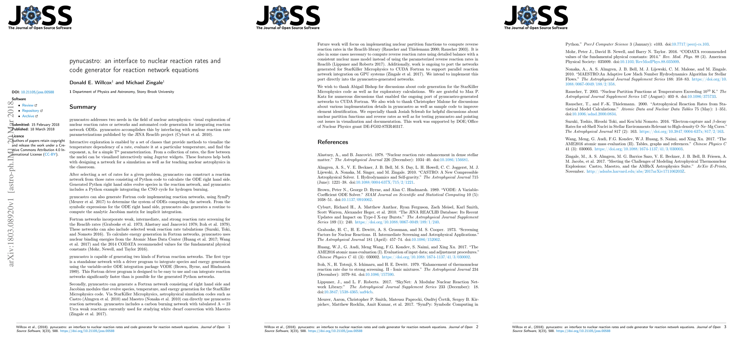 pynucastro addresses two needs in the field of nuclear astrophysics: visual exploration of nuclear reaction rates or networks and automated code generation for integrating reaction network ODEs. pynucastro accomplishes this by interfacing with nuclear reaction rate parameterizations published by the JINA Reaclib project (Cyburt et al. 2010).