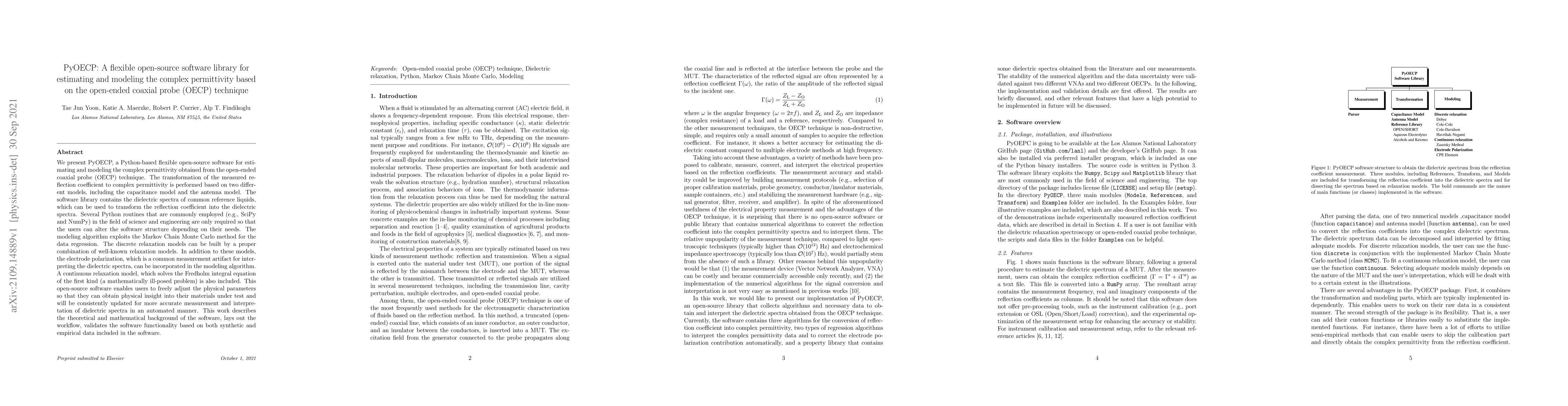 PyOECP is an open-source Python library for estimating and modeling complex permittivity from open-ended coaxial probe measurements using capacitance and antenna models. It includes advanced modeling algorithms, such as Markov Chain Monte Carlo and Fredholm integral equation solvers, to interpret dielectric spectra and accounts for electrode polarization.