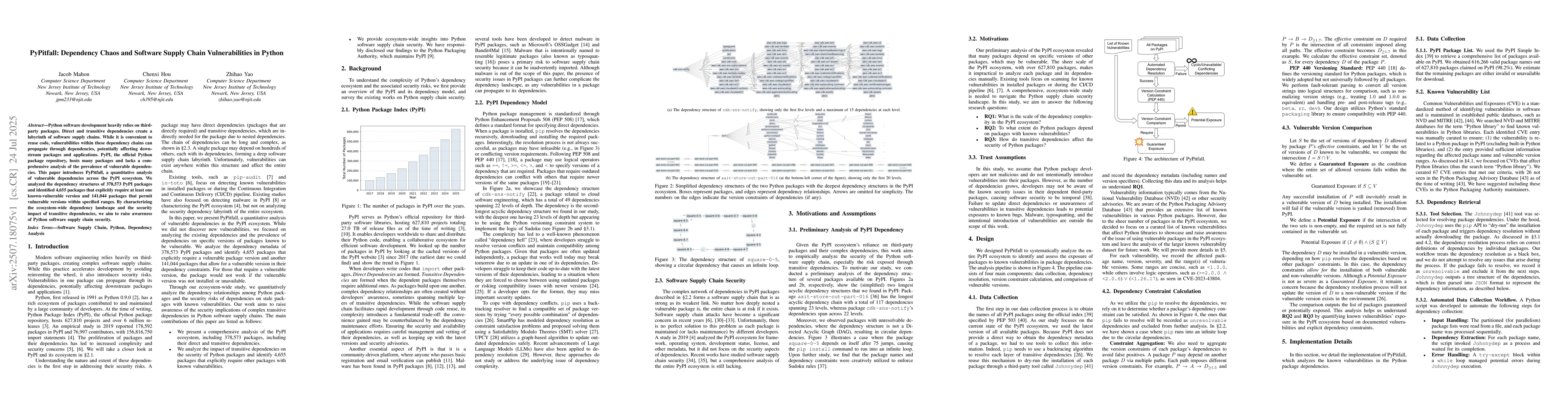Python software development heavily relies on third-party packages. Direct and transitive dependencies create a labyrinth of software supply chains. While it is convenient to reuse code, vulnerabilities within these dependency chains can propagate through dependencies, potentially affecting down-stream packages and applications. PyPI, the official Python package repository, hosts many packages and lacks a comprehensive analysis of the prevalence of vulnerable dependencies. This paper introduces PyPitfall, a quantitative analysis of vulnerable dependencies across the PyPI ecosystem. We analyzed the dependency structures of 378,573 PyPI packages and identified 4,655 packages that explicitly require at least one known-vulnerable version and 141,044 packages that permit vulnerable versions within specified ranges. By characterizing the ecosystem-wide dependency landscape and the security impact of transitive dependencies, we aim to raise awareness of Python software supply chain security.