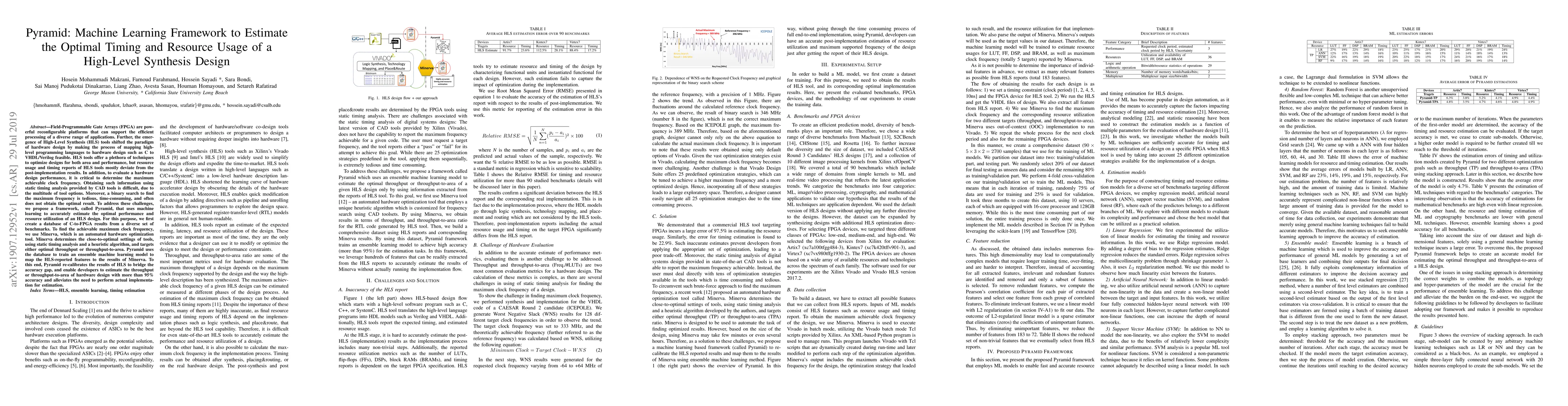 Pyramid is a machine learning framework for estimating the optimal timing and resource usage of High-Level Synthesis (HLS) designs. It leverages an ensemble model trained on a database of benchmark results to accurately predict performance and resource utilization, bridging the gap between HLS tool reports and post-implementation outcomes.