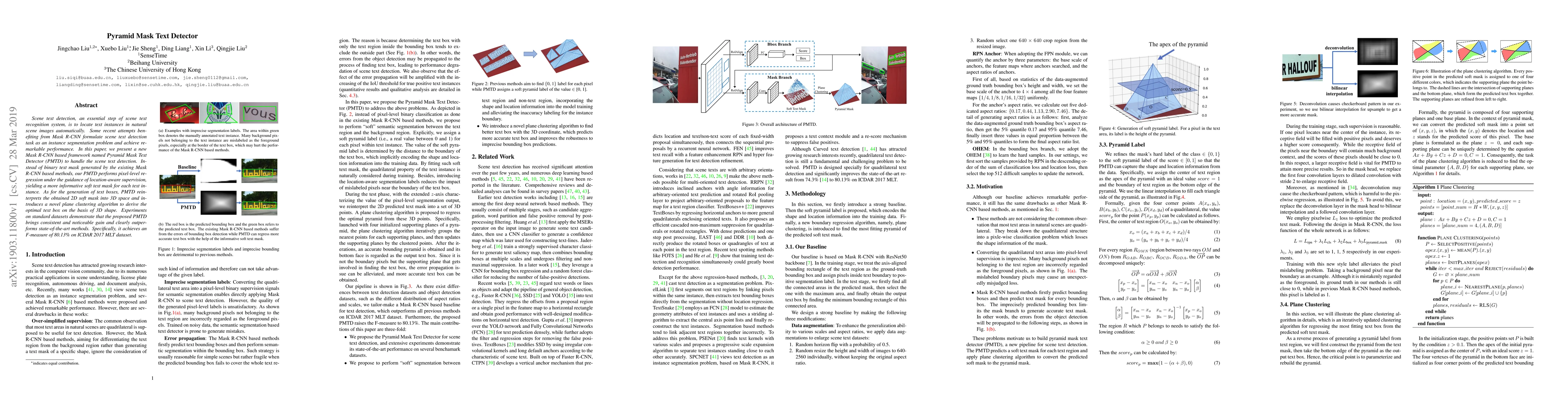 The Pyramid Mask Text Detector (PMTD) leverages Mask R-CNN to enhance scene text detection through pixel-level regression and soft text mask generation, achieving superior performance over existing methods. PMTD's novel plane clustering algorithm for text box generation and its 3D shape interpretation yield an F-measure of 80.13% on the ICDAR 2017 MLT dataset.