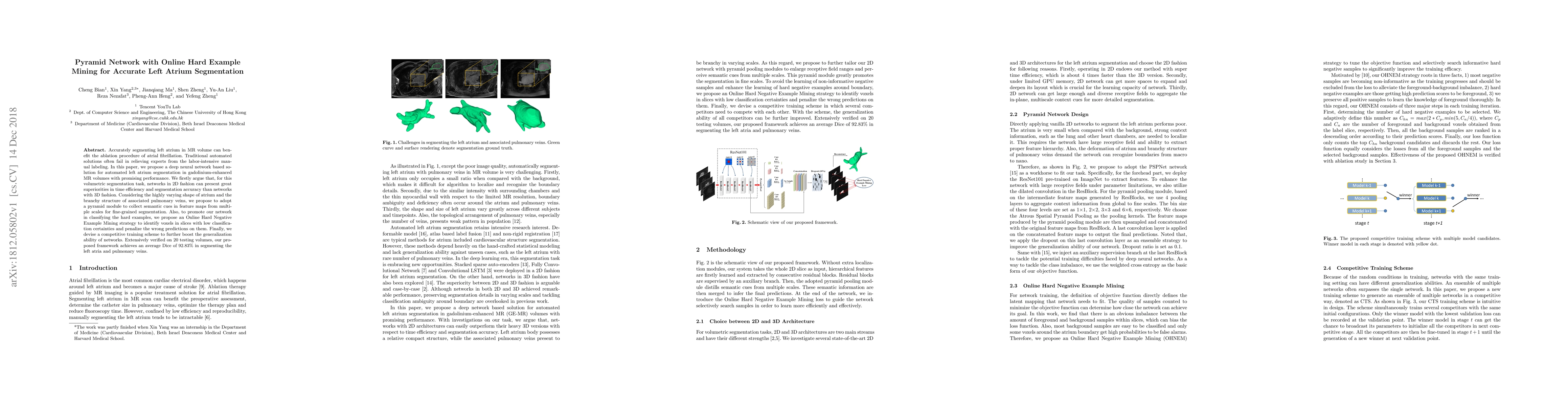 Accurately segmenting left atrium in MR volume can benefit the ablation procedure of atrial fibrillation. Traditional automated solutions often fail in relieving experts from the labor-intensive manual labeling. In this paper, we propose a deep neural network based solution for automated left atrium segmentation in gadolinium-enhanced MR volumes with promising performance. We firstly argue that, for this volumetric segmentation task, networks in 2D fashion can present great superiorities in time efficiency and segmentation accuracy than networks with 3D fashion. Considering the highly varying shape of atrium and the branchy structure of associated pulmonary veins, we propose to adopt a pyramid module to collect semantic cues in feature maps from multiple scales for fine-grained segmentation. Also, to promote our network in classifying the hard examples, we propose an Online Hard Negative Example Mining strategy to identify voxels in slices with low classification certainties and penalize the wrong predictions on them. Finally, we devise a competitive training scheme to further boost the generalization ability of networks. Extensively verified on 20 testing volumes, our proposed framework achieves an average Dice of 92.83% in segmenting the left atria and pulmonary veins.