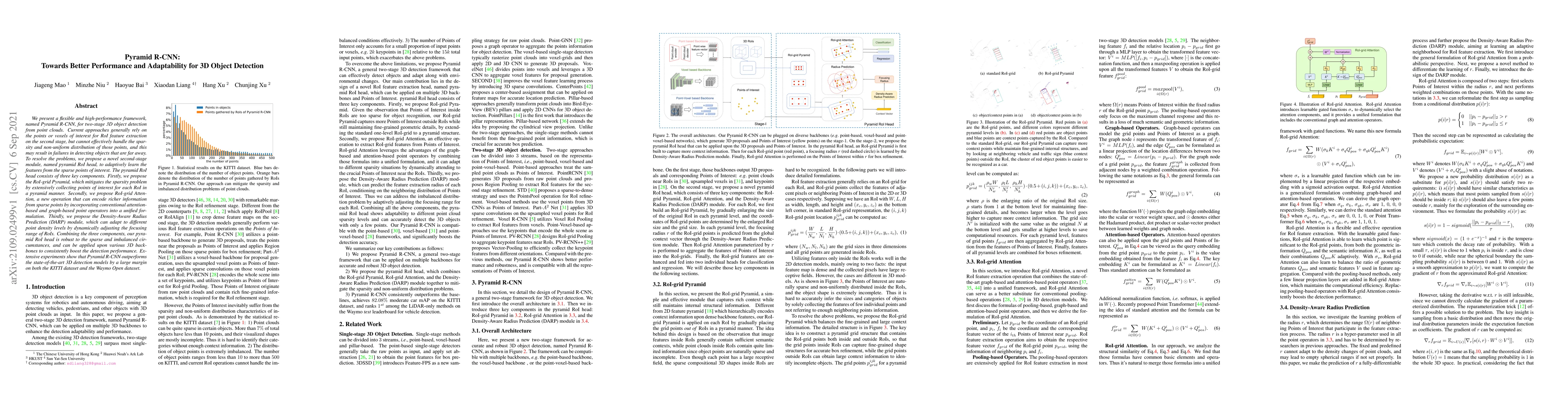 We present a flexible and high-performance framework, named Pyramid R-CNN, for two-stage 3D object detection from point clouds. Current approaches generally rely on the points or voxels of interest for RoI feature extraction on the second stage, but cannot effectively handle the sparsity and non-uniform distribution of those points, and this may result in failures in detecting objects that are far away. To resolve the problems, we propose a novel second-stage module, named pyramid RoI head, to adaptively learn the features from the sparse points of interest. The pyramid RoI head consists of three key components. Firstly, we propose the RoI-grid Pyramid, which mitigates the sparsity problem by extensively collecting points of interest for each RoI in a pyramid manner. Secondly, we propose RoI-grid Attention, a new operation that can encode richer information from sparse points by incorporating conventional attention-based and graph-based point operators into a unified formulation. Thirdly, we propose the Density-Aware Radius Prediction (DARP) module, which can adapt to different point density levels by dynamically adjusting the focusing range of RoIs. Combining the three components, our pyramid RoI head is robust to the sparse and imbalanced circumstances, and can be applied upon various 3D backbones to consistently boost the detection performance. Extensive experiments show that Pyramid R-CNN outperforms the state-of-the-art 3D detection models by a large margin on both the KITTI dataset and the Waymo Open dataset.