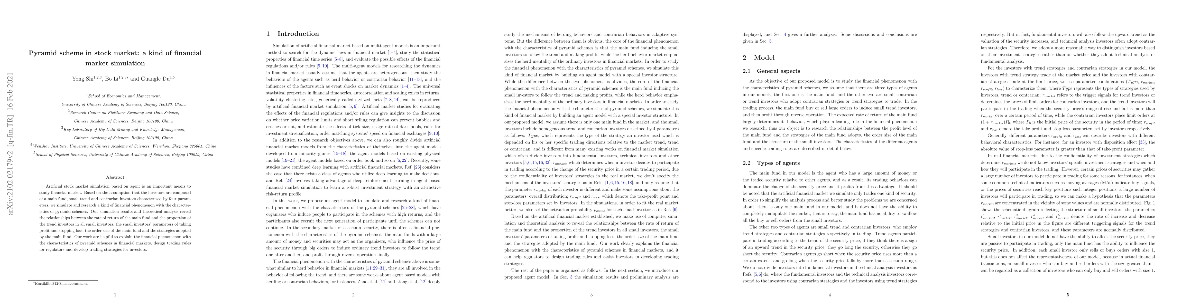 Artificial stock market simulation based on agent is an important means to study financial market. Based on the assumption that the investors are composed of a main fund, small trend and contrarian investors characterized by four parameters, we simulate and research a kind of financial phenomenon with the characteristics of pyramid schemes. Our simulation results and theoretical analysis reveal the relationships between the rate of return of the main fund and the proportion of the trend investors in all small investors, the small investors' parameters of taking profit and stopping loss, the order size of the main fund and the strategies adopted by the main fund. Our work are helpful to explain the financial phenomenon with the characteristics of pyramid schemes in financial markets, design trading rules for regulators and develop trading strategies for investors.