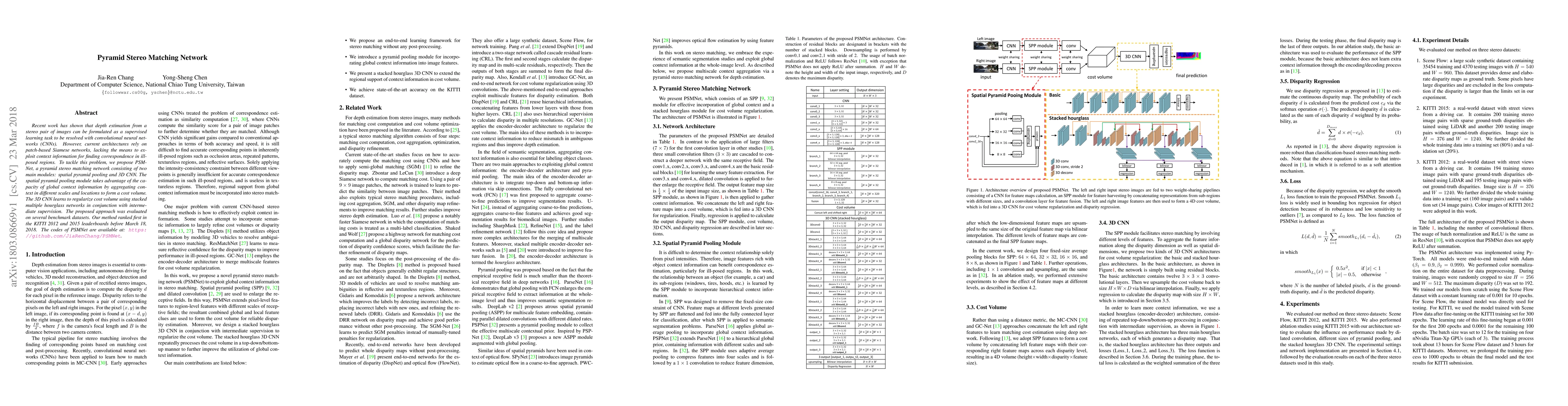 The Pyramid Stereo Matching Network (PSMNet) proposes a novel architecture combining spatial pyramid pooling and 3D CNN to enhance depth estimation from stereo images by leveraging global context information and intermediate supervision. PSMNet outperformed other methods on the KITTI 2012 and 2015 benchmarks.