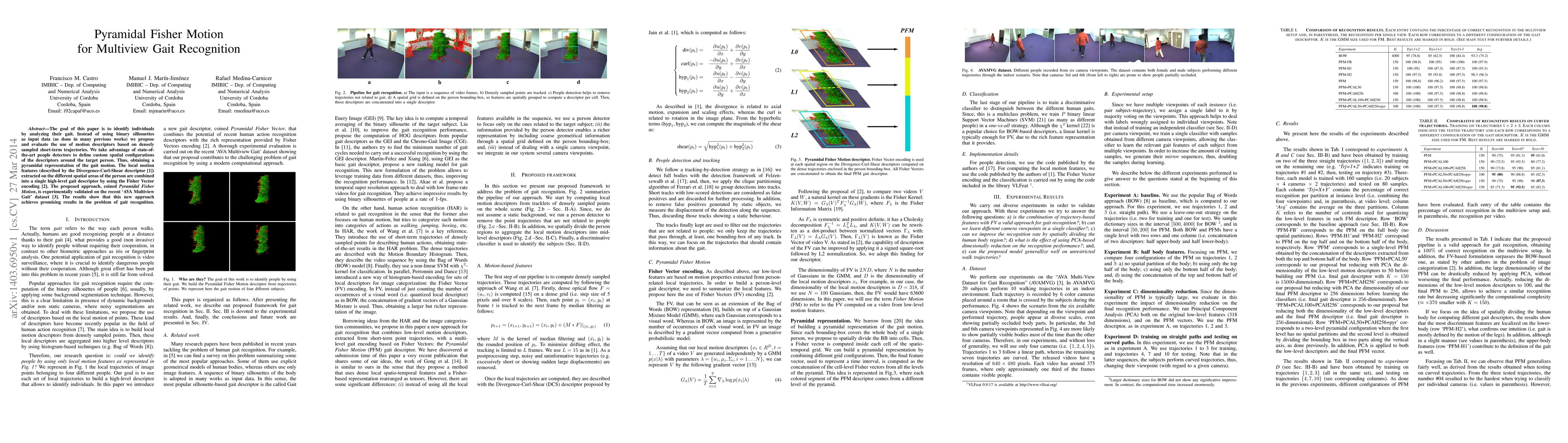 This paper proposes a Pyramidal Fisher Motion approach for multiview gait recognition using densely sampled short-term trajectories instead of binary silhouettes. It combines local motion features into a high-level gait descriptor via Fisher Vector encoding, achieving promising results on the AVA Multiview Gait dataset.