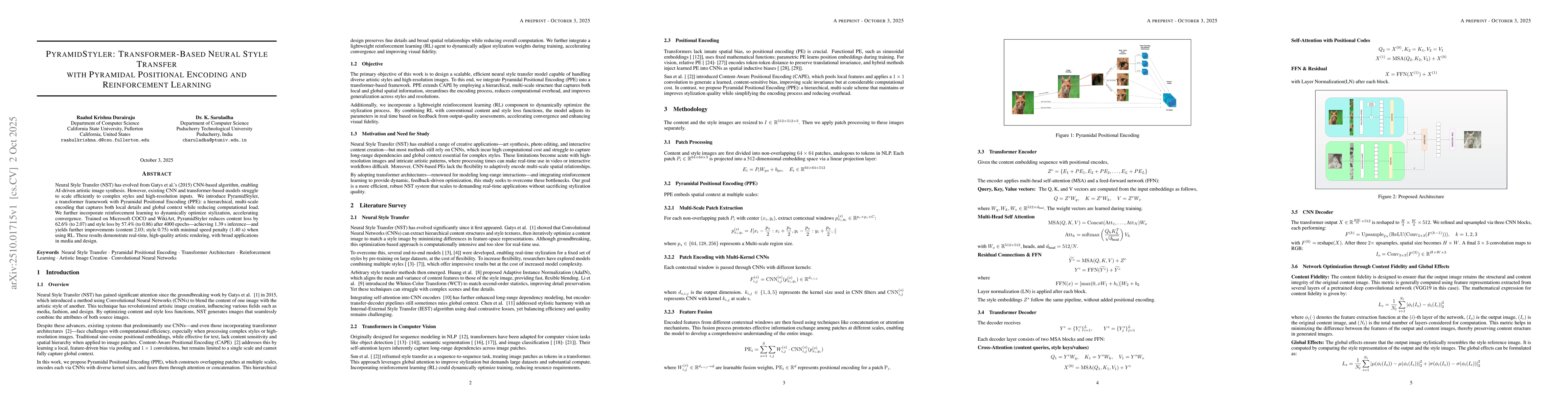 The research introduces PyramidStyler, a transformer-based neural style transfer framework incorporating Pyramidal Positional Encoding (PPE) and reinforcement learning (RL). It uses multi-head self-attention and feed-forward networks in both encoder and decoder stages, with PPE enabling hierarchical, multi-scale spatial encoding. The model is trained on Microsoft COCO and WikiArt datasets, optimizing content and style losses with identity losses and RL for dynamic optimization.