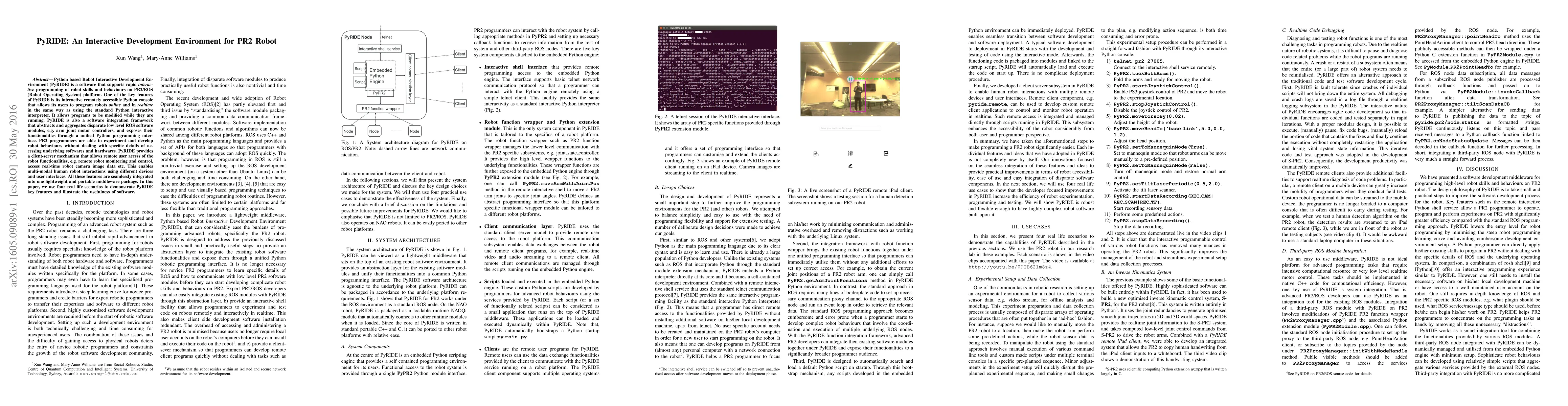 PyRIDE is an interactive Python-based development environment for programming PR2 robots on the ROS platform, featuring a real-time, remotely accessible Python console for online programming. It abstracts low-level ROS modules and enables multi-modal human-robot interactions through a client-server mechanism.