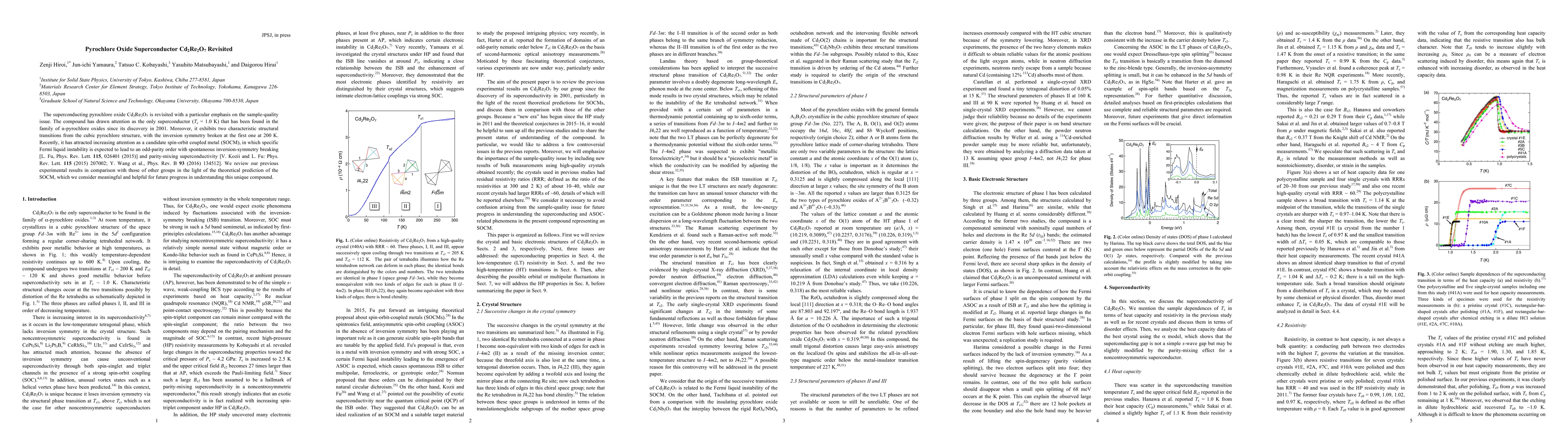The research re-examines Cd2Re2O7, the sole superconductor in pyrochlore oxides with Tc = 1.0 K, emphasizing sample quality. It compares previous findings with new theoretical predictions of a spin-orbit coupled metal (SOCM), suggesting Fermi liquid instability leading to odd-parity order and parity-mixing superconductivity, aiding in understanding this unique compound.