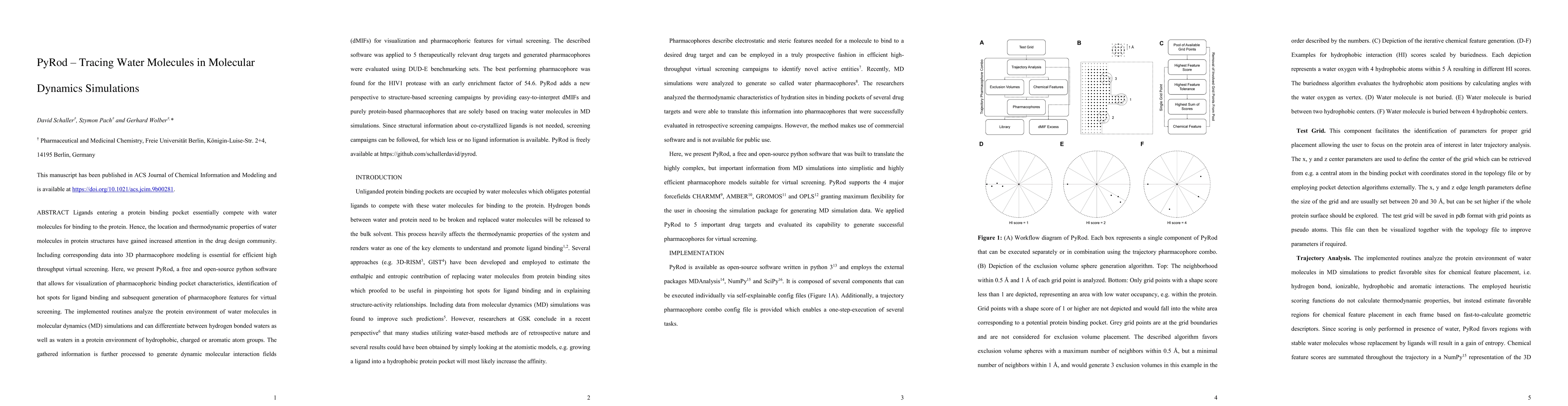Ligands entering a protein binding pocket essentially compete with water molecules for binding to the protein. Hence, the location and thermodynamic properties of water molecules in protein structures have gained increased attention in the drug design community. Including corresponding data into 3D pharmacophore modeling is essential for efficient high throughput virtual screening. Here, we present PyRod, a free and open-source python software that allows for visualization of pharmacophoric binding pocket characteristics, identification of hot spots for ligand binding and subsequent generation of pharmacophore features for virtual screening. The implemented routines analyze the protein environment of water molecules in molecular dynamics (MD) simulations and can differentiate between hydrogen bonded waters as well as waters in a protein environment of hydrophobic, charged or aromatic atom groups. The gathered information is further processed to generate dynamic molecular interaction fields (dMIFs) for visualization and pharmacophoric features for virtual screening. The described software was applied to 5 therapeutically relevant drug targets and generated pharmacophores were evaluated using DUD-E benchmarking sets. The best performing pharmacophore was found for the HIV1 protease with an early enrichment factor of 54.6. PyRod adds a new perspective to structure-based screening campaigns by providing easy-to-interpret dMIFs and purely protein-based 3D pharmacophores that are solely based on tracing water molecules in MD simulations. Since structural information about co-crystallized ligands is not needed, screening campaigns can be followed, for which less or no ligand information is available. PyRod is freely available at https://github.com/schallerdavid/pyrod.