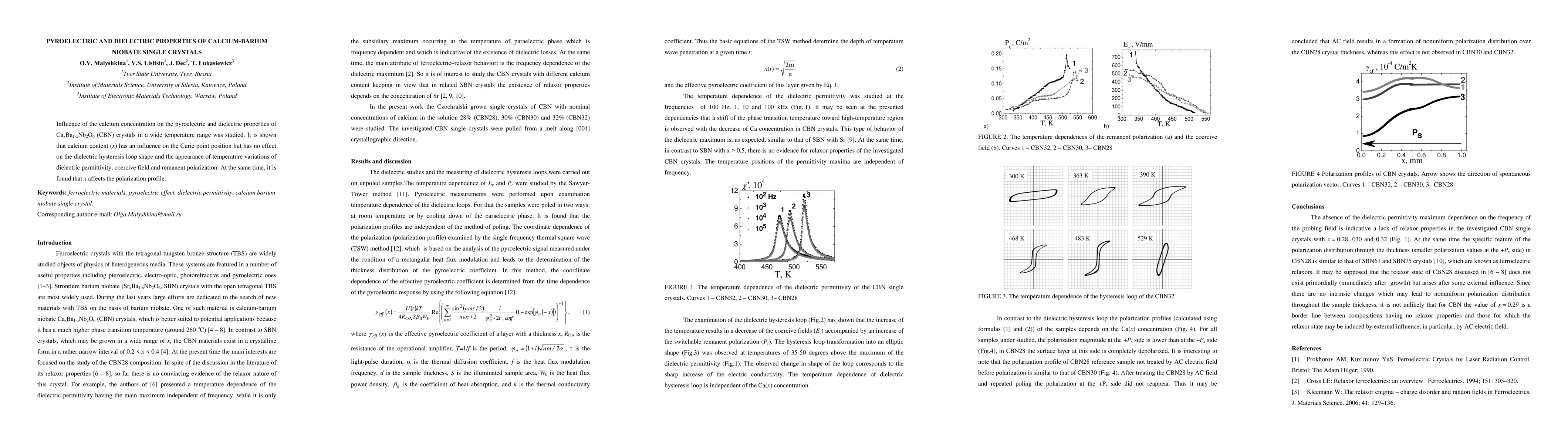 Influence of the calcium concentration on the pyroelectric and dielectric properties of CaxBa1-xNb2O6 (CBN) crystals in a wide temperature range was studied. It is shown that calcium content (x) has an influence on the Curie point position but has no effect on the dielectric hysteresis loop shape and the appearance of temperature variations of dielectric permittivity, coercive field and remanent polarization. At the same time, it is found that x affects the polarization profile.