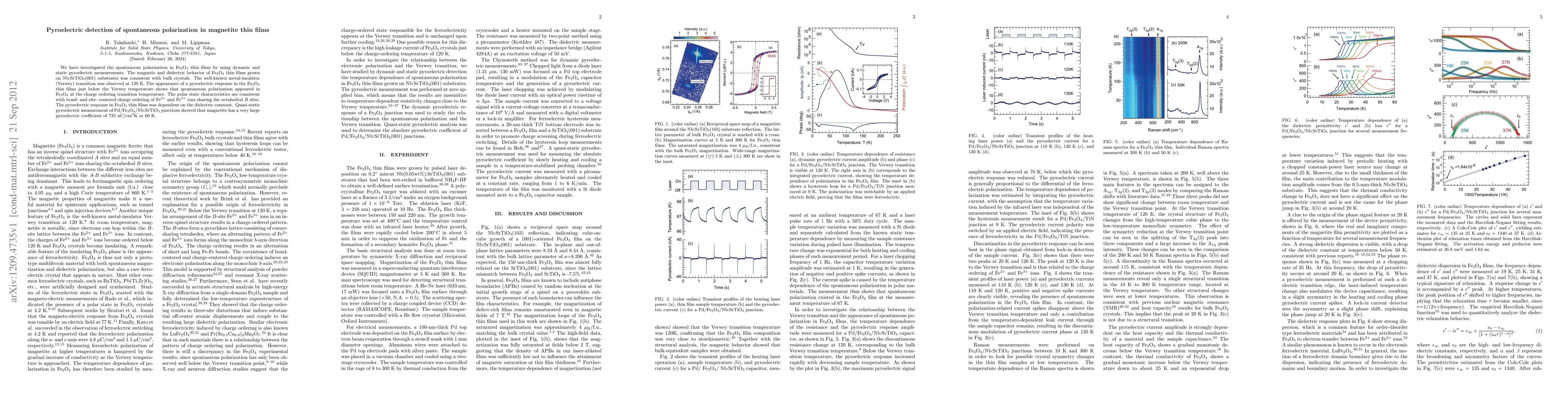 This study investigates the spontaneous polarization in magnetite (Fe$_3$O$_4$) thin films using pyroelectric measurements, revealing a significant pyroelectric response just below the Verwey transition temperature, indicative of charge ordering. The films exhibit a large pyroelectric coefficient of 735 nC/cm$^{2}$K at 60 K.