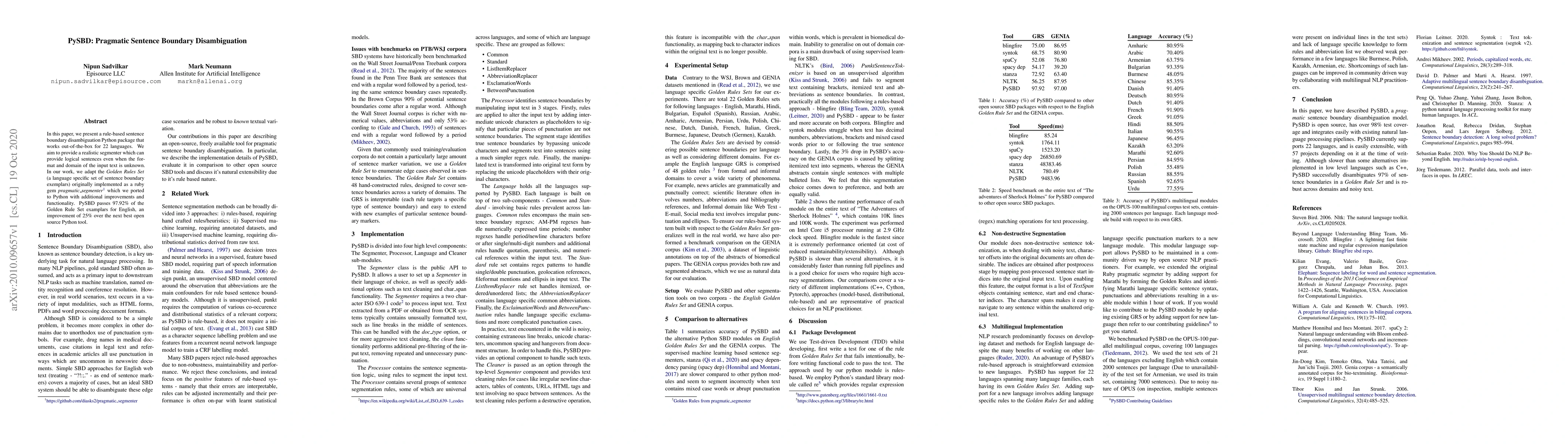 In this paper, we present a rule-based sentence boundary disambiguation Python package that works out-of-the-box for 22 languages. We aim to provide a realistic segmenter which can provide logical sentences even when the format and domain of the input text is unknown. In our work, we adapt the Golden Rules Set (a language-specific set of sentence boundary exemplars) originally implemented as a ruby gem - pragmatic_segmenter - which we ported to Python with additional improvements and functionality. PySBD passes 97.92% of the Golden Rule Set exemplars for English, an improvement of 25% over the next best open-source Python tool.