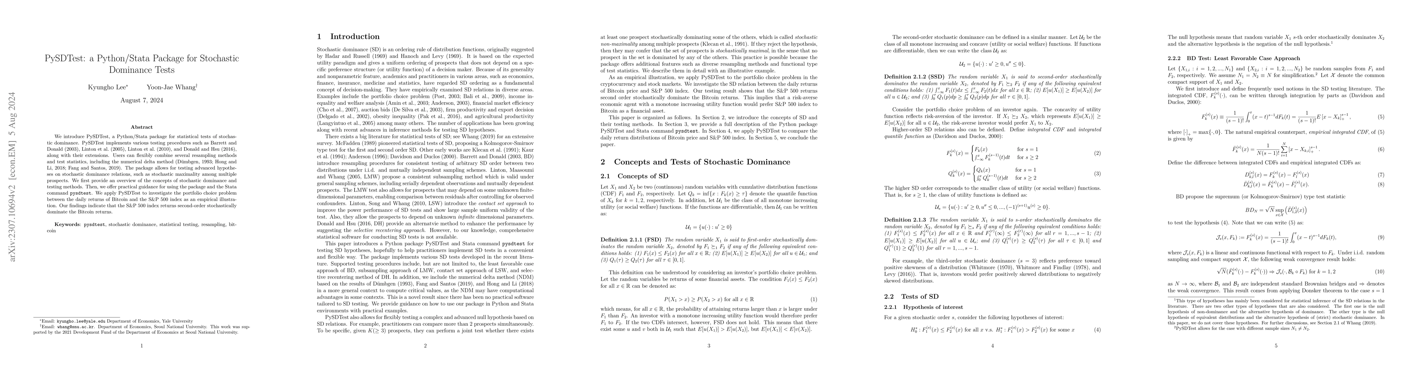 PySDTest is a Python package for conducting various stochastic dominance tests, supporting multiple testing procedures and critical value computation methods. It is applied to compare Bitcoin and S&P 500 index returns, finding that S&P 500 dominates Bitcoin under second-order stochastic dominance.