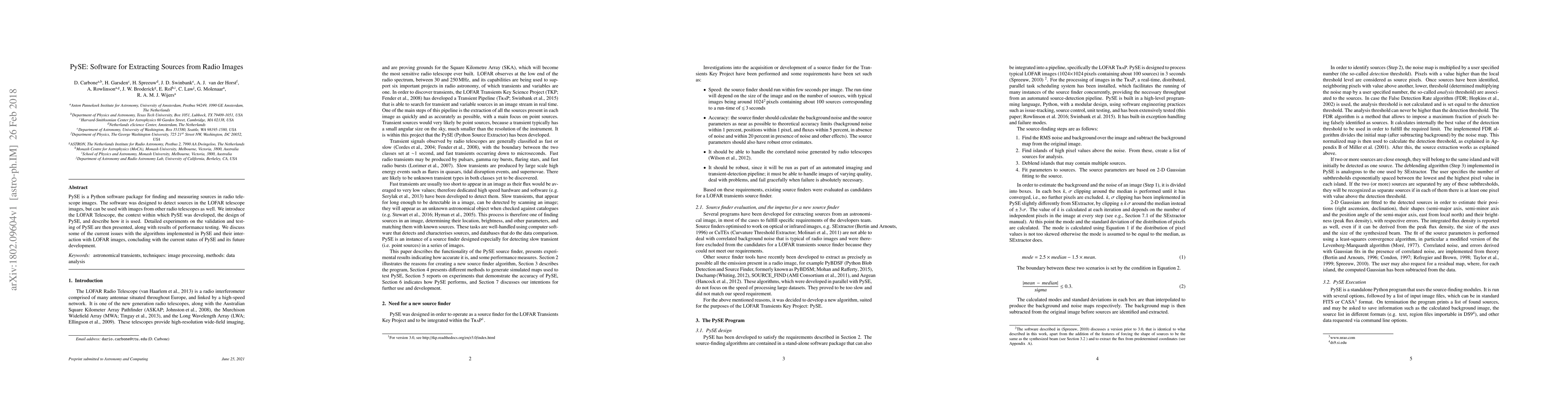 PySE is a Python software package for finding and measuring sources in radio telescope images. The software was designed to detect sources in the LOFAR telescope images, but can be used with images from other radio telescopes as well. We introduce the LOFAR Telescope, the context within which PySE was developed, the design of PySE, and describe how it is used. Detailed experiments on the validation and testing of PySE are then presented, along with results of performance testing. We discuss some of the current issues with the algorithms implemented in PySE and their inter- action with LOFAR images, concluding with the current status of PySE and its future development.