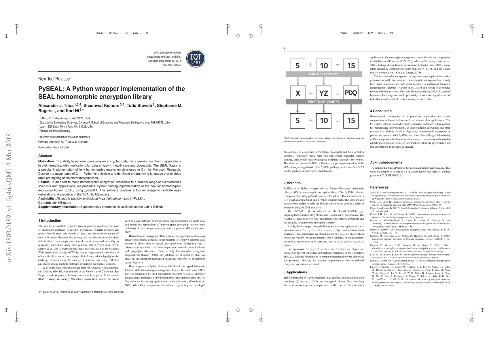 PySEAL provides a Python wrapper for the SEAL homomorphic encryption library, enabling bioinformatics researchers to leverage homomorphic encryption in Python. The implementation includes a Docker image for easy installation and is publicly available on GitHub.