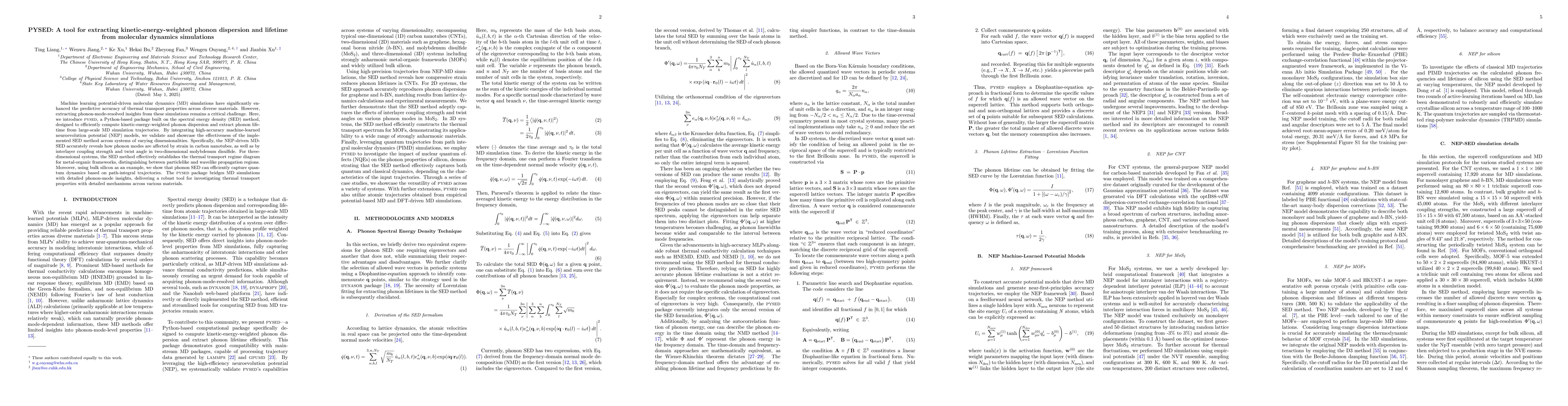 The research introduces PYSED, a Python-based package that utilizes the spectral energy density (SED) method to compute kinetic-energy-weighted phonon dispersion and extract phonon lifetimes from large-scale molecular dynamics (MD) simulations. It integrates high-accuracy machine-learned neuroevolution potential (NEP) models to validate the SED method across systems of varying dimensionalities.