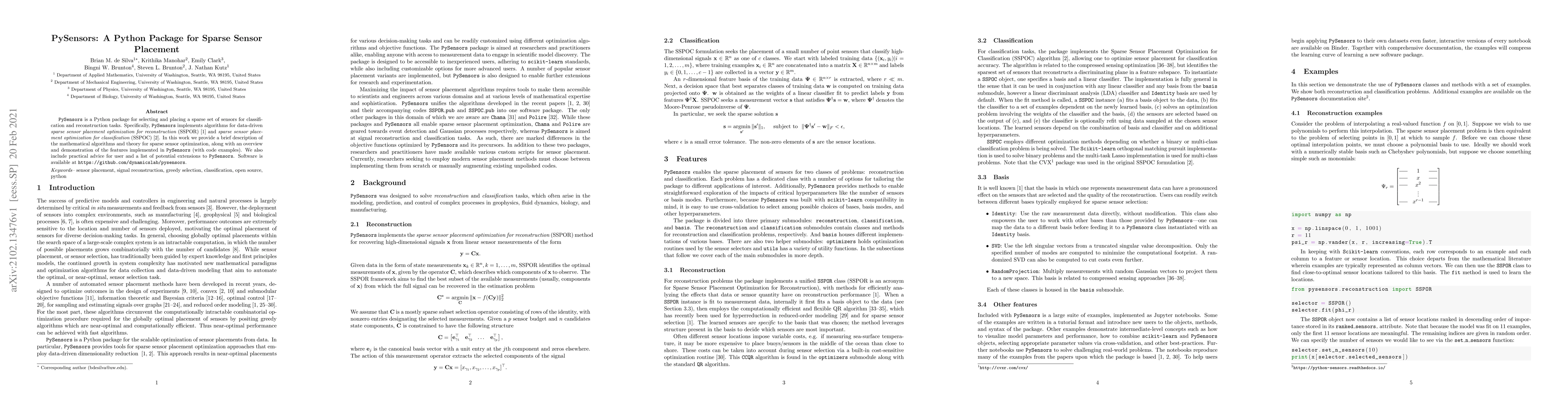 PySensors is a Python package designed for optimizing the placement of sparse sensors for classification and reconstruction tasks. It implements algorithms for sparse sensor placement optimization, with practical advice and extensions available for users.