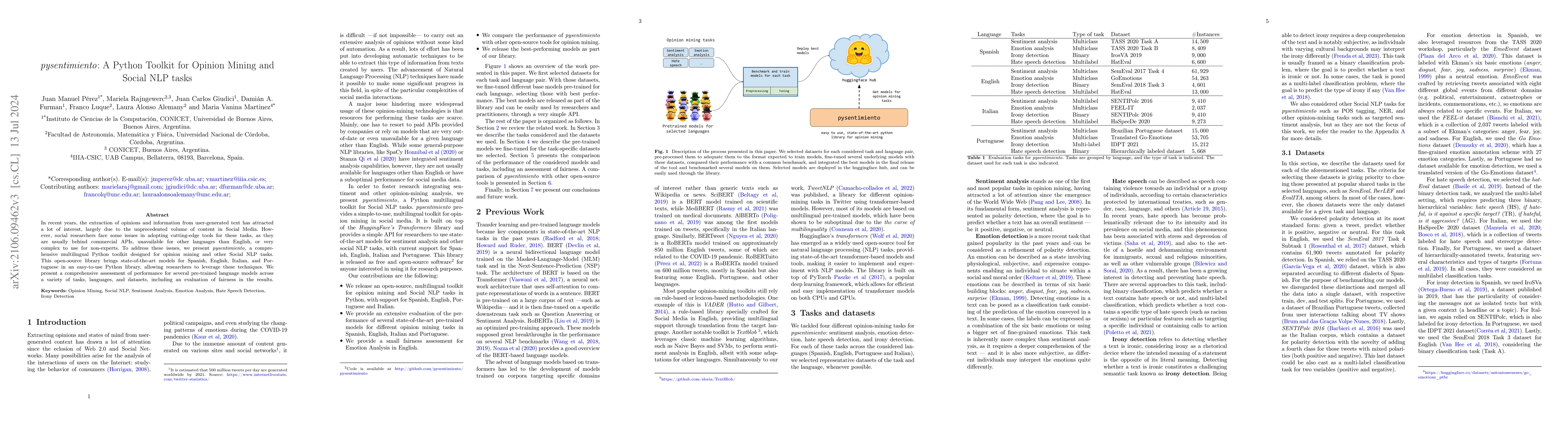 pysentimiento is a multilingual Python toolkit for opinion mining and social NLP tasks, offering state-of-the-art models for Spanish, English, Italian, and Portuguese to facilitate research without commercial API restrictions. The paper evaluates the performance and fairness of various pre-trained models across different languages and datasets.