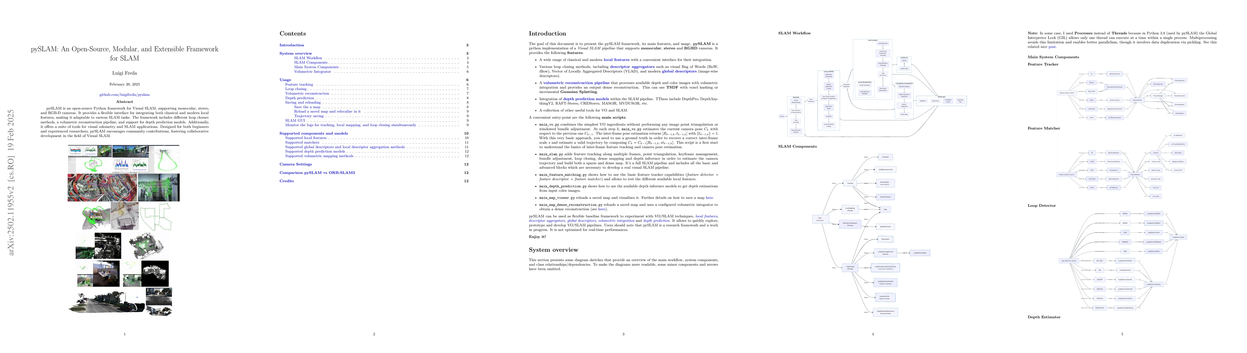 Summary: pySLAM is an open-source Python framework for Visual SLAM that supports monocular, stereo, and RGB-D cameras, offering tools for visual odometry and adaptable to various SLAM tasks through its modular design and collaborative development ethos.