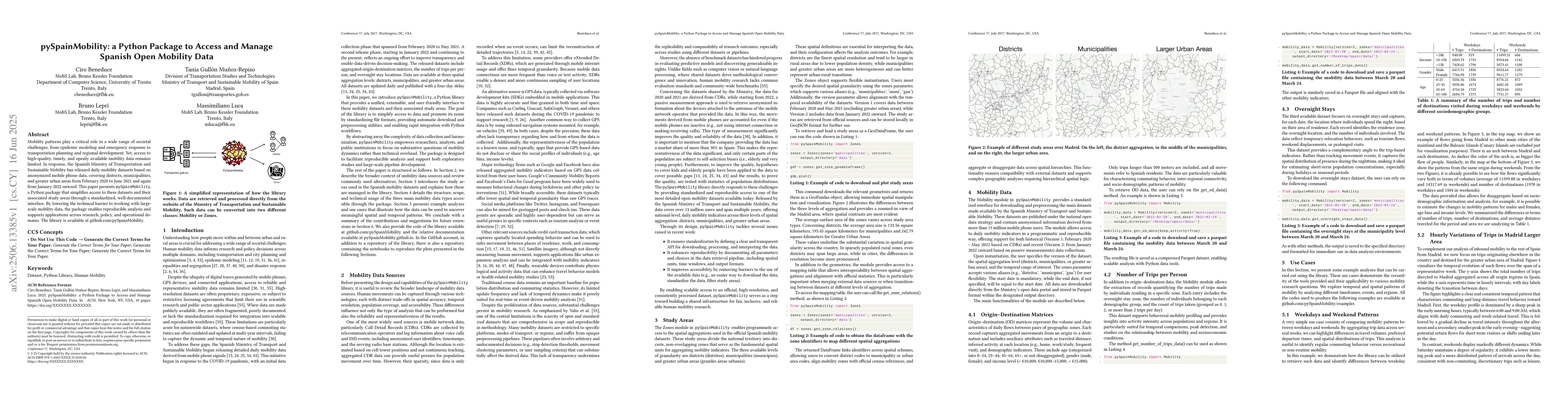 Mobility patterns play a critical role in a wide range of societal challenges, from epidemic modeling and emergency response to transportation planning and regional development. Yet, access to high-quality, timely, and openly available mobility data remains limited. In response, the Spanish Ministry of Transportation and Sustainable Mobility has released daily mobility datasets based on anonymized mobile phone data, covering districts, municipalities, and greater urban areas from February 2020 to June 2021 and again from January 2022 onward. This paper presents pySpainMobility, a Python package that simplifies access to these datasets and their associated study areas through a standardized, well-documented interface. By lowering the technical barrier to working with large-scale mobility data, the package enables reproducible analysis and supports applications across research, policy, and operational domains. The library is available at https://github.com/pySpainMobility.