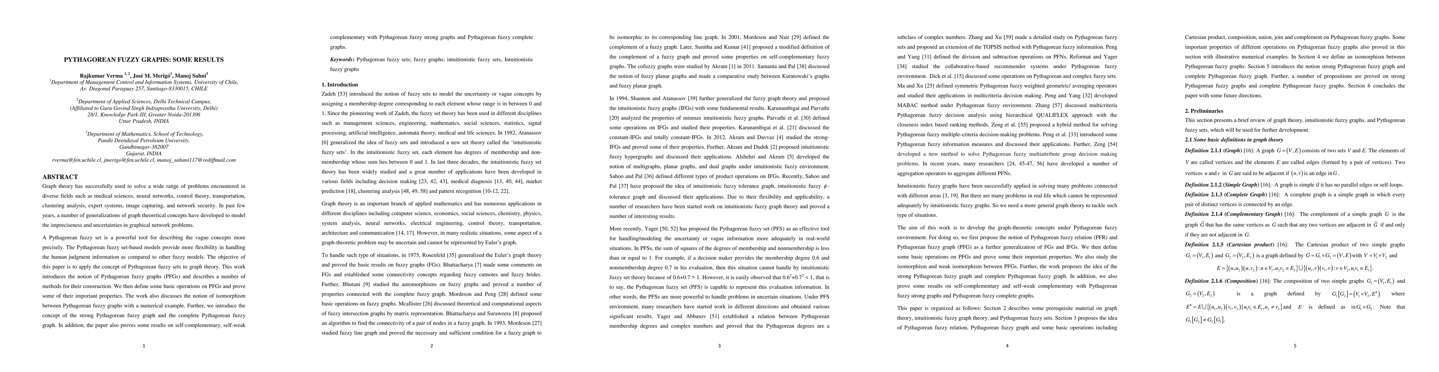 This paper introduces Pythagorean fuzzy graphs (PFGs) by applying Pythagorean fuzzy set theory to graph theory, outlining methods for constructing PFGs and defining basic operations and properties. It also discusses isomorphism, strong PFGs, and complete PFGs, and proves results on self-complementary and self-weak complementary properties.