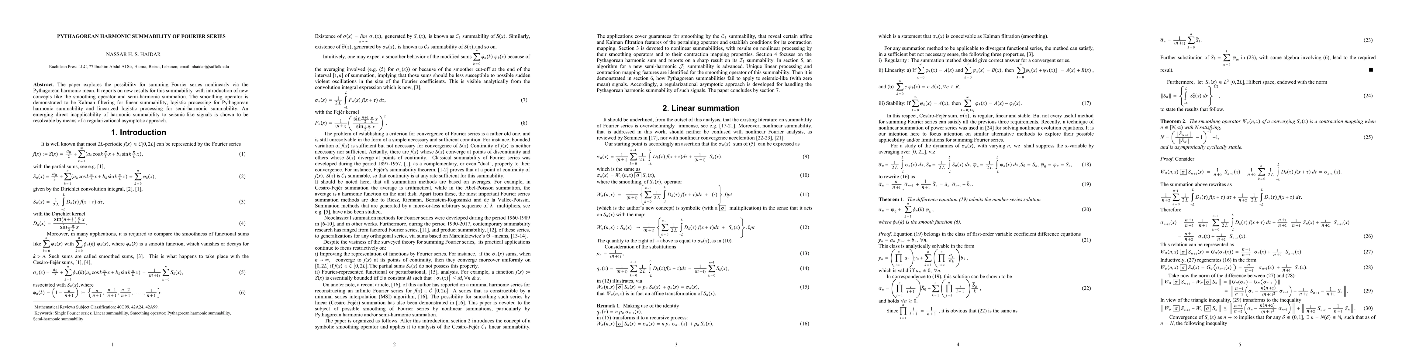The paper explores the possibility for summing Fourier series nonlinearly via the Pythagorean harmonic mean. It reports on new results for this summability with introduction of new concepts like the smoothing operator and semi-harmonic summation. The smoothing operator is demonstrated to be Kalman filtering for linear summability, logistic processing for Pythagorean harmonic summability and linearized logistic processing for semi-harmonic summability. An emerging direct inapplicability of harmonic summability to seismic-like signals is shown to be resolvable by means of a regularizational asymptotic approach.