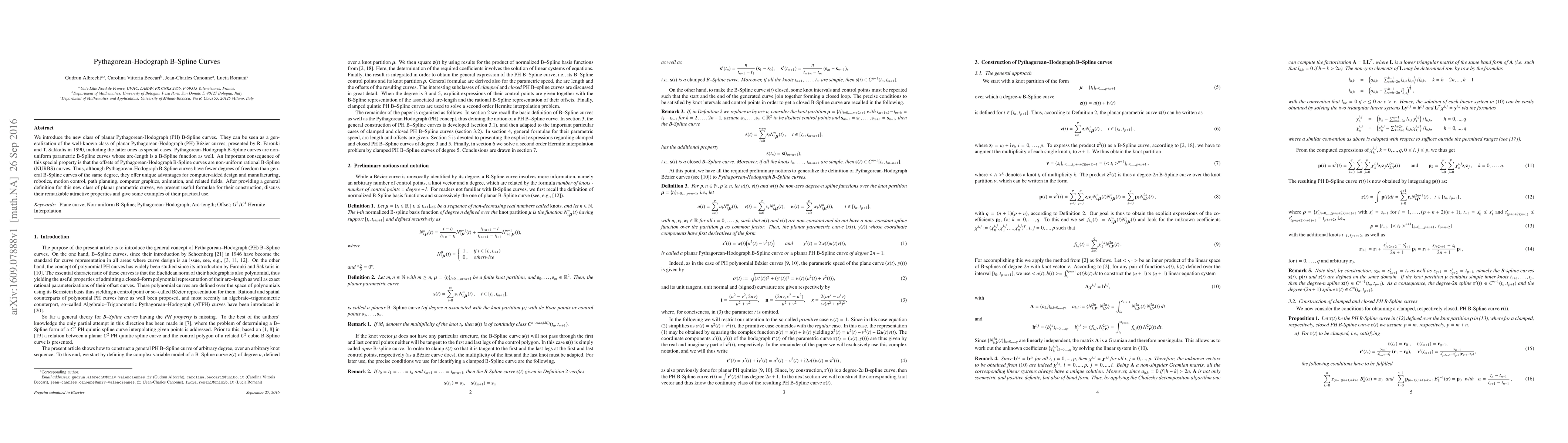 This paper introduces planar Pythagorean-Hodograph B-Spline curves, a generalization of PH Bézier curves, with the arc-length being a B-Spline function, offering unique advantages in various fields like CAD, robotics, and animation. The paper provides construction formulae and discusses their practical applications.