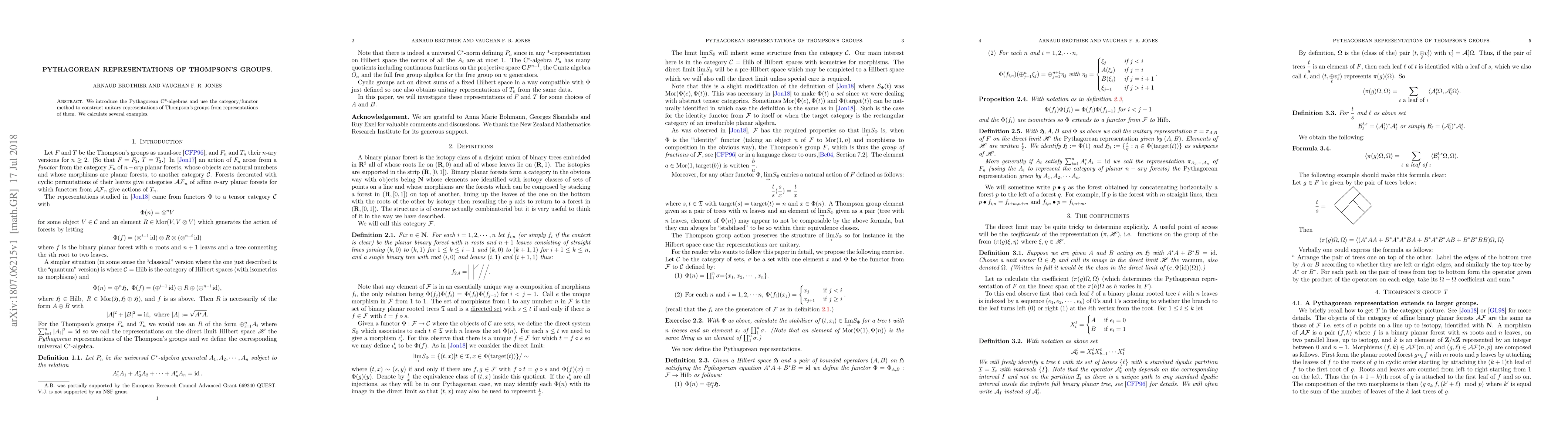 This paper introduces Pythagorean C*-algebras and employs category/functor methods to construct unitary representations of Thompson's groups, providing calculations for several examples. The methodology bridges abstract algebra and functional analysis.